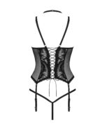 Elegante set met een zeer verleidelijke uitstraling. Van luxe kant en met fijne details afgewerkt. Met ondersteunende beugelcups voor een fijne pasvorm en decolleté. Elastisch kant en vetersluiting aan de achterkant. Inclusief afgebeelde string, exclusief kousen.