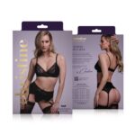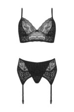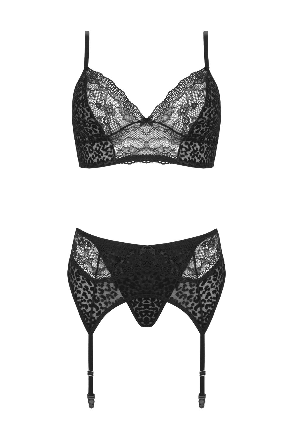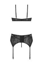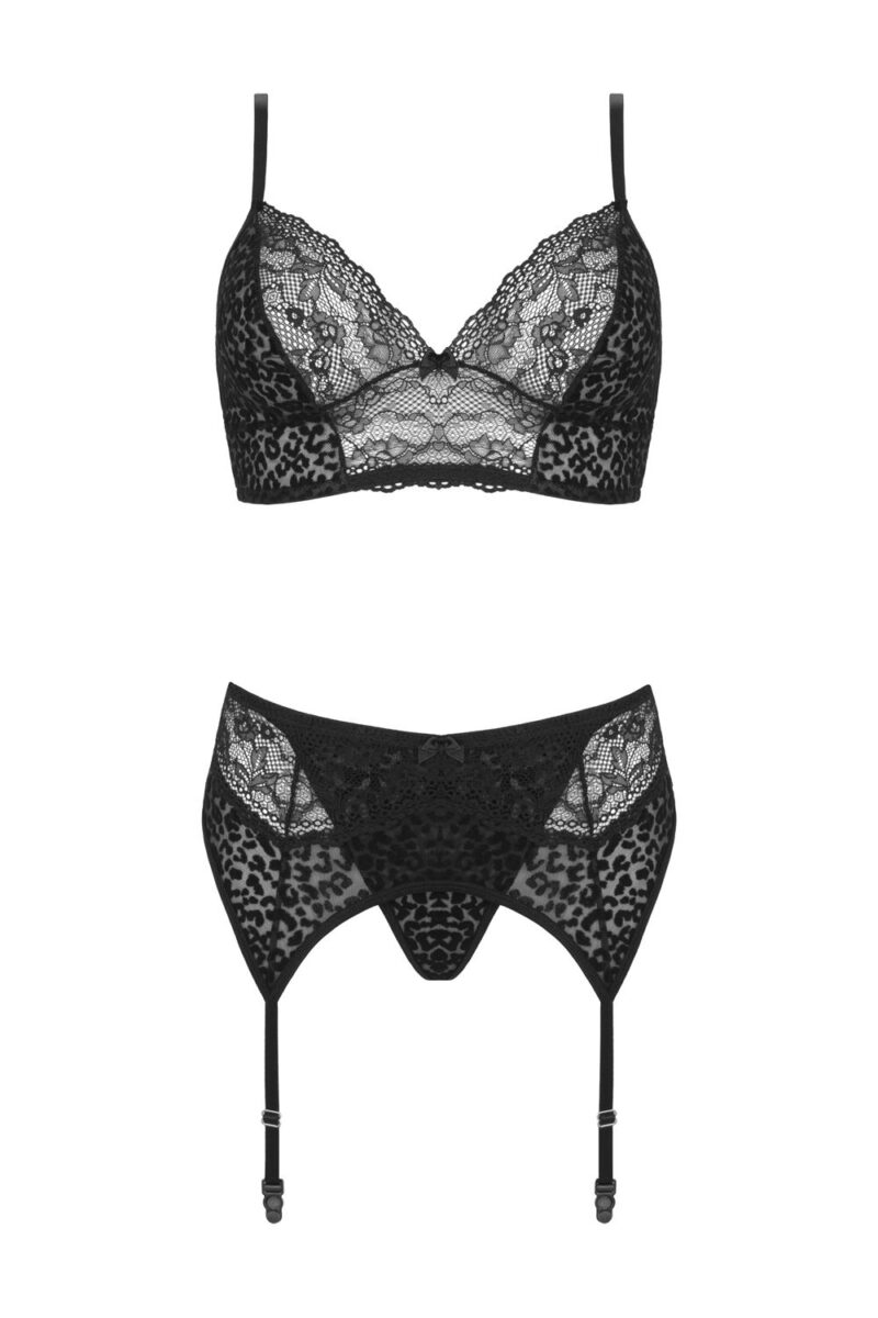Sensueel setje bestaande uit 3 delen, een bh-topje of beter gezegd bralette met triangelcups (niet voorgevormd en geen beugel), een G-string en een jarretelgordel. Sexy en comfortabel tegelijkertijd. De zwarte luipardprint geeft het setje een stoere uitstraling, de combinatie met kant zorgt voor een sensuele touch. Zachte, elastische materialen zorgen voor een aangename pasvorm. De schouder- en jarretelbandjes zijn verstelbaar. De Bh en de gordel hebben aan de achterkant een haakjessluiting zodat de artikelen goed aansluiten.