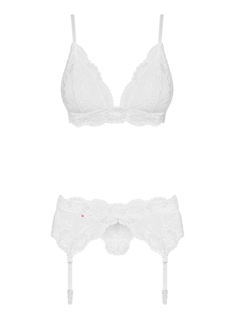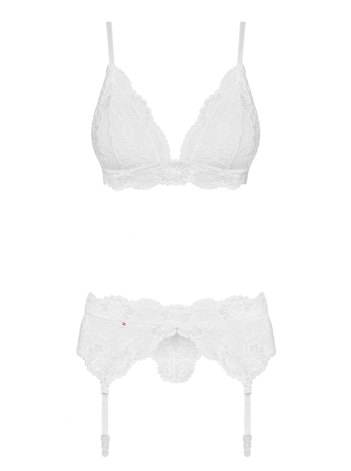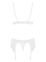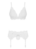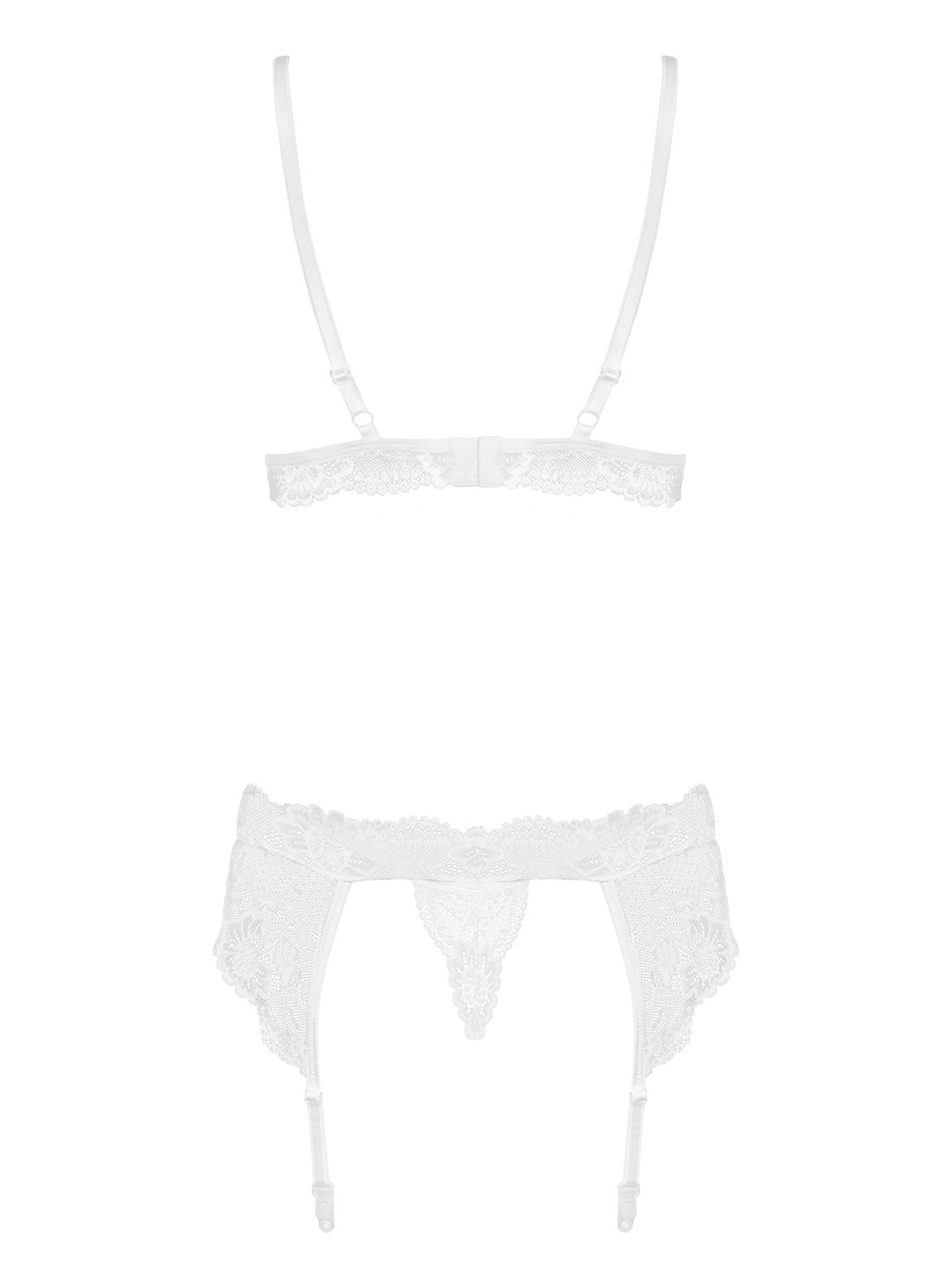 Verleid je partner in deze opvallende 3-delige jarretel set! Deze set heeft prachtige kanten details en bestaat uit een BH met soft cups, een jarretel gordel en een bijpassende sexy string. De jarretel gordel laat de billen gedeeltelijk vrij voor een uitdagende look! Deze set heeft verstelbare bandjes en draagt comfortabel dankzij het elastische materiaal. Maak de outfit compleet met een paar mooie kousen.