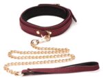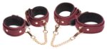 Deze prachtige 6-delige boeienset is een luxe uitbreiding voor alle liefhebbers van bdsm! De set bestaat uit verstelbare pols en enkelboeien, een collar en een riem. Uitgevoerd in een sexy bordeauxrode kleur, gemaakt van vegan PU suede en nikkelvrije goudkleurige metalen details. De kettinkjes zijn eventueel ook los te halen van de boeien. Verras elkaar met deze mooie set en geniet samen van een spannende kinky avond.