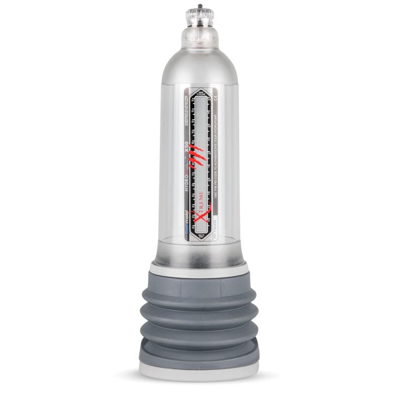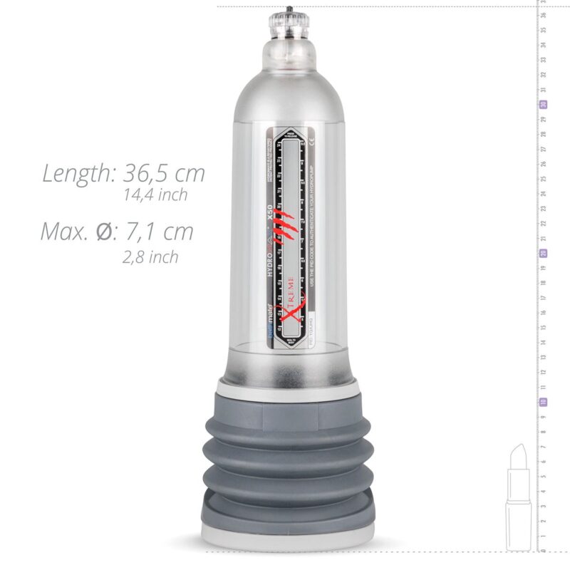 De HydroXtreme 11 is een luxe penispomp die je gebruikt met water. Vul de pomp met lauwwarm water, plaats hem over je penis en druk vervolgens de basis tegen je lichaam. Het water zal langzaam uit de pomp gaan en de penis wordt vacuüm gezogen voor meer volume. De HydroXtreme 11 is de meest krachtige pomp uit de collectie en is geschikt voor mannen met een penislengte van meer dan 23 cm (tijdens erectie). De pomp wordt geleverd met vele extra’s zoals:
