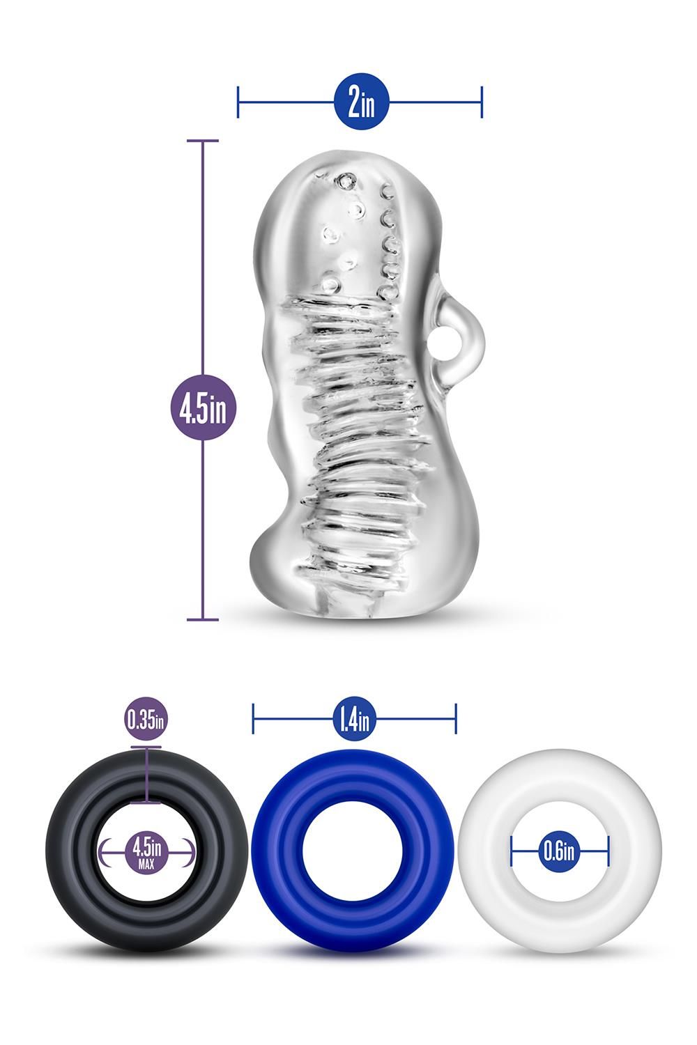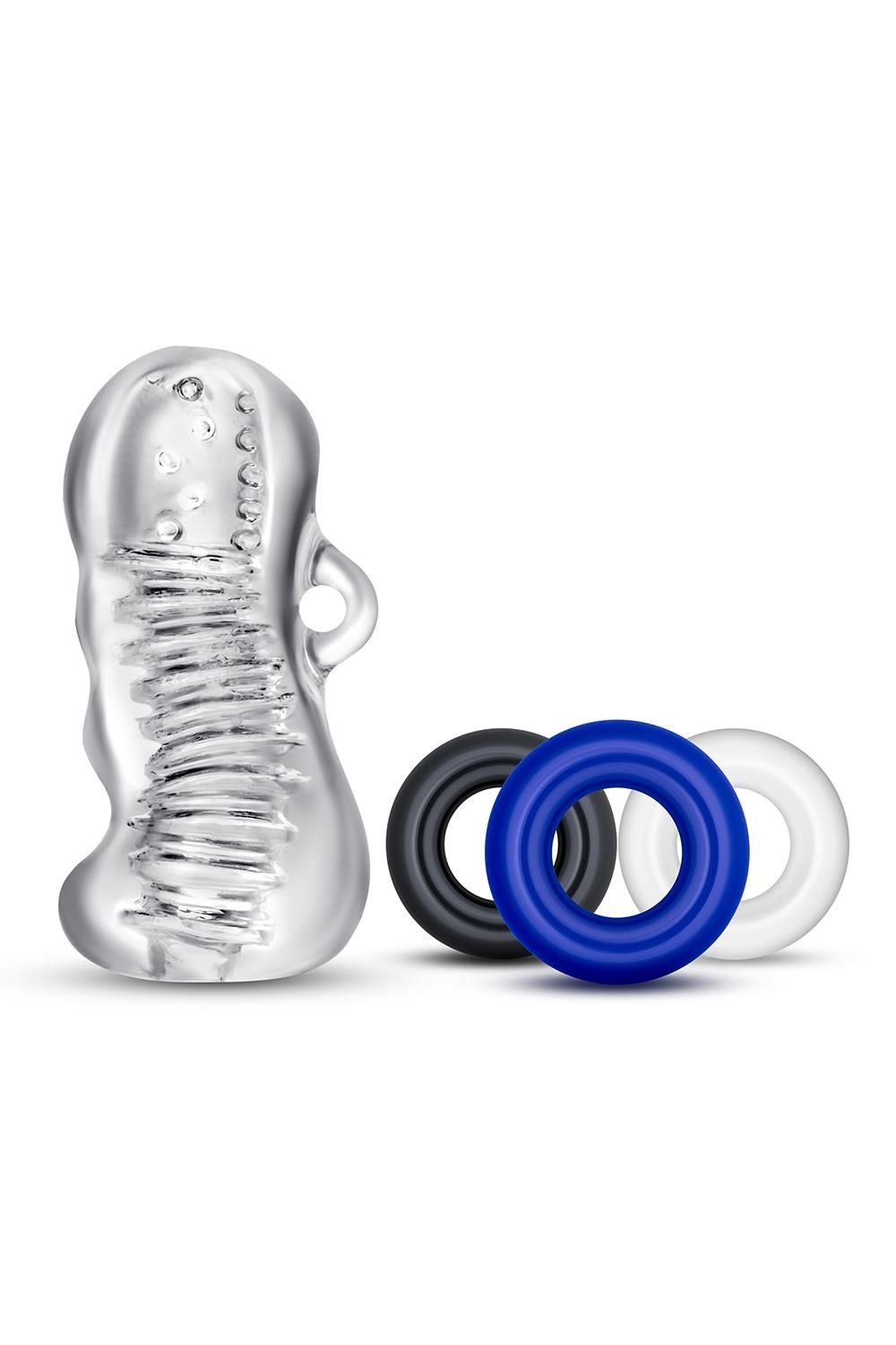 De sleeve is gemaakt van lichaamsveilig materiaal en werkt het beste met een waterbasis glijmiddel. Met handige grips en drie cockrings (diameter 3,5 cm) biedt deze set veelzijdigheid en controle.