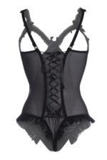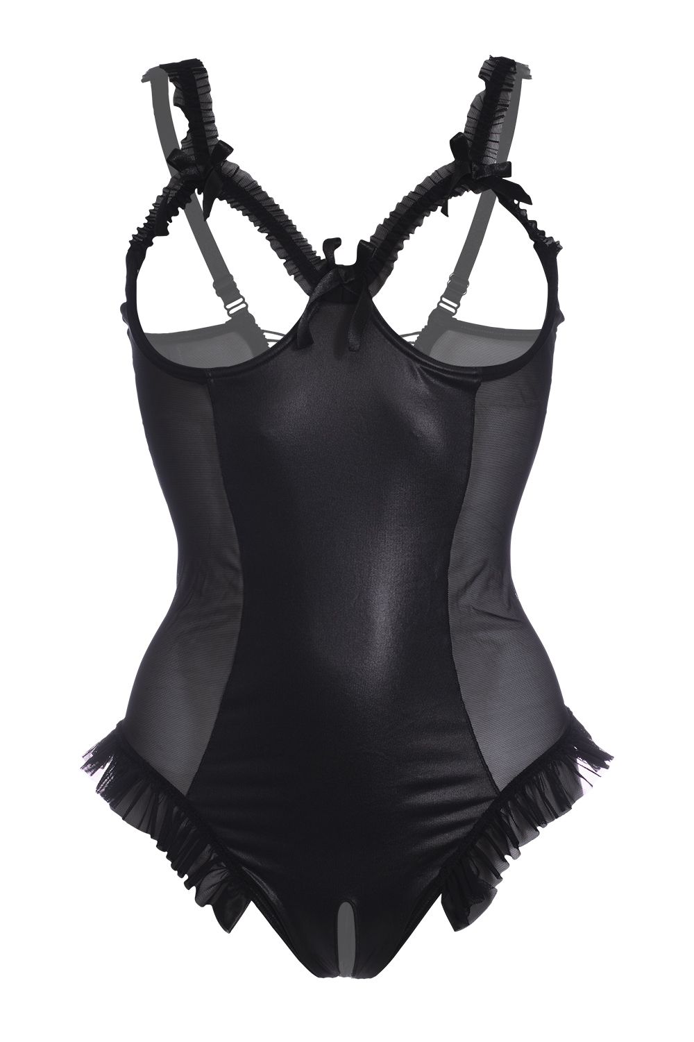 Stoute body met wetlook voorkant en transparante mesh aan de zijkanten. Open cups en open kruis. De cups hebben beugels voor extra steun aan je borsten. Satijnen vetersluiting aan de achterkant.