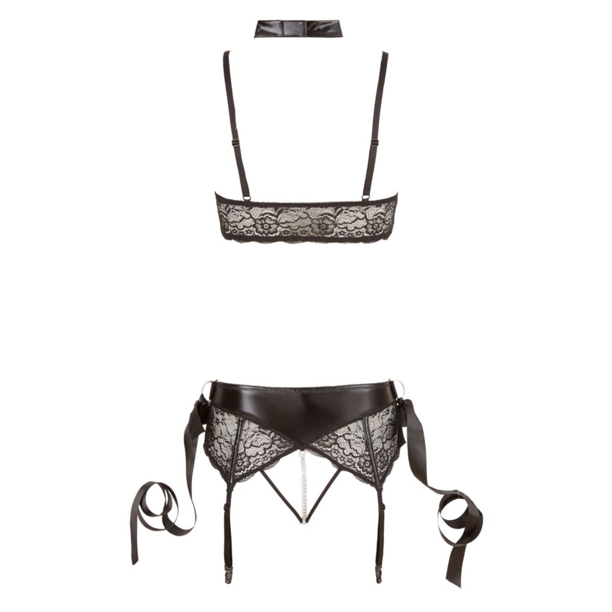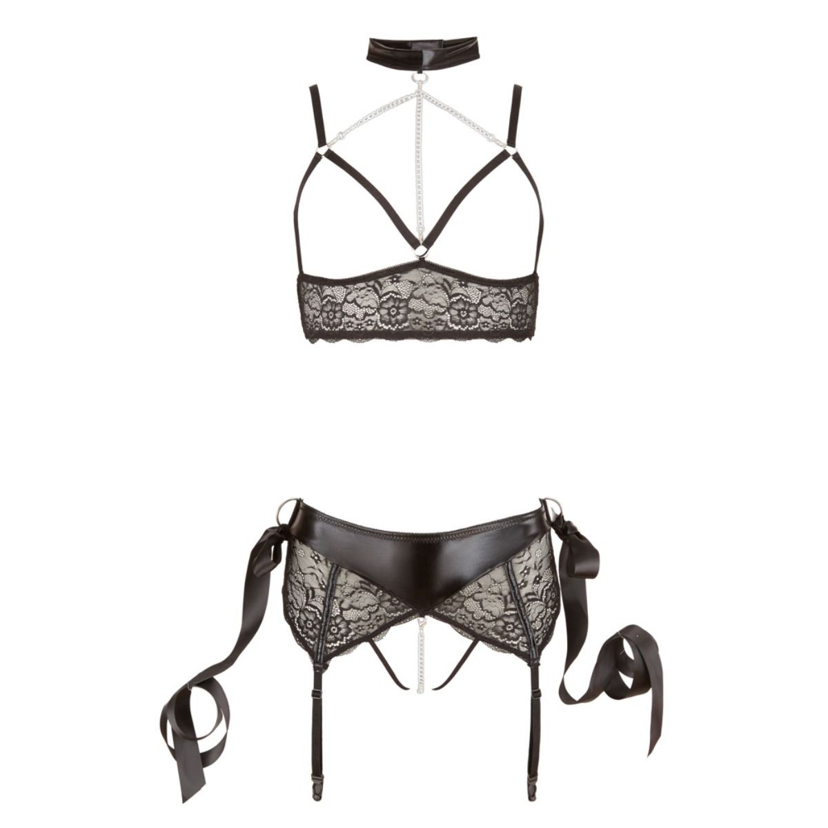 Dit sexy jarretelsetje is perfect om te dragen wanneer jij en je partner verlangen naar meer. De jarretelset is namelijk voorzien van spannende details die jou kennis laten maken met bondage. Zo heeft de BH met open cups een wetlook halsband en een afneembare ketting. Dezelfde ketting komt terug in de jarretelgordel. Deze ketting loopt tussen de intieme zones door voor een intense sensatie tijdens het dragen. Alle kettingen zijn afneembaar. Op de gordel zijn D-ringen geplaatst waaraan je de satijnen bondageboeien kunt bevestigen.