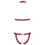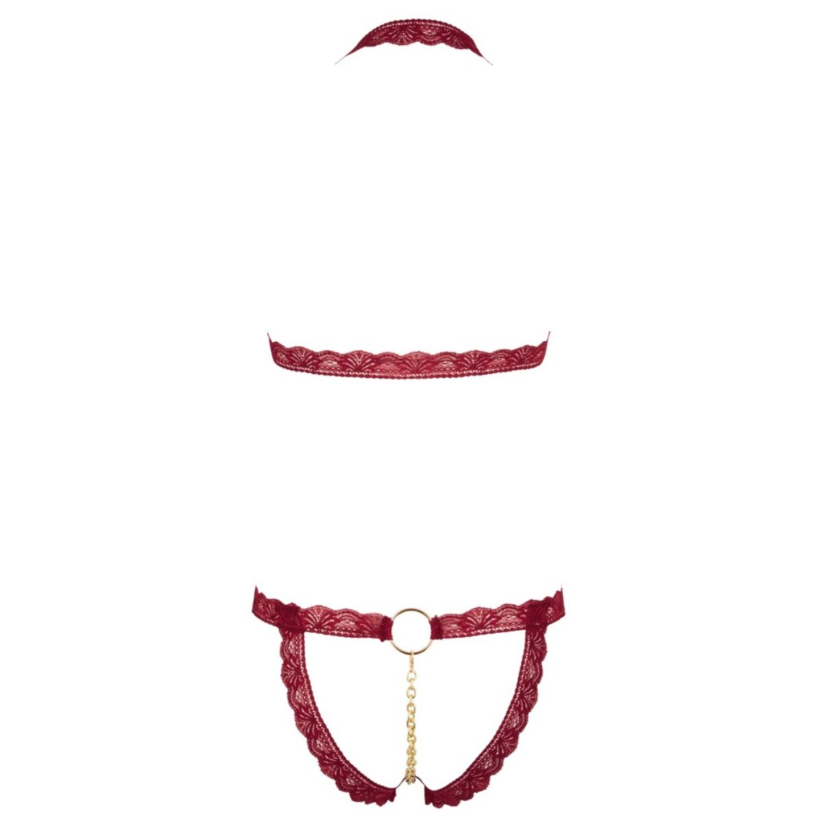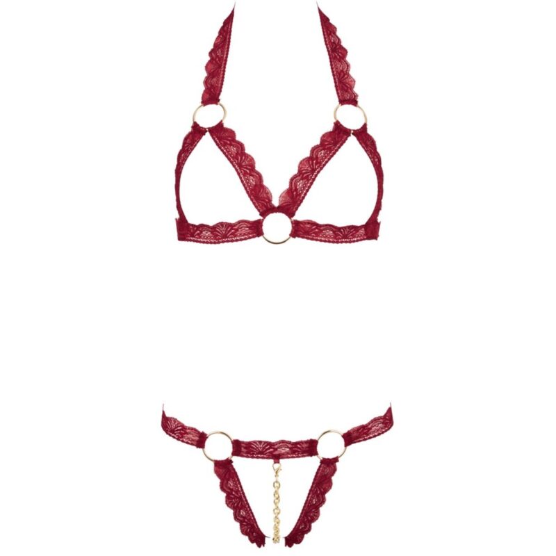 Dit verleidelijke kanten setje in dieprood bestaat uit een BH met open cups en goudkleurige ringen. De BH heeft een halternek. Het bijpassende broekje heeft een stringmodel en een open kruisje. Het kettinkje maakt dit broekje nog spannender. De set is gemaakt van zachte elastische stof.