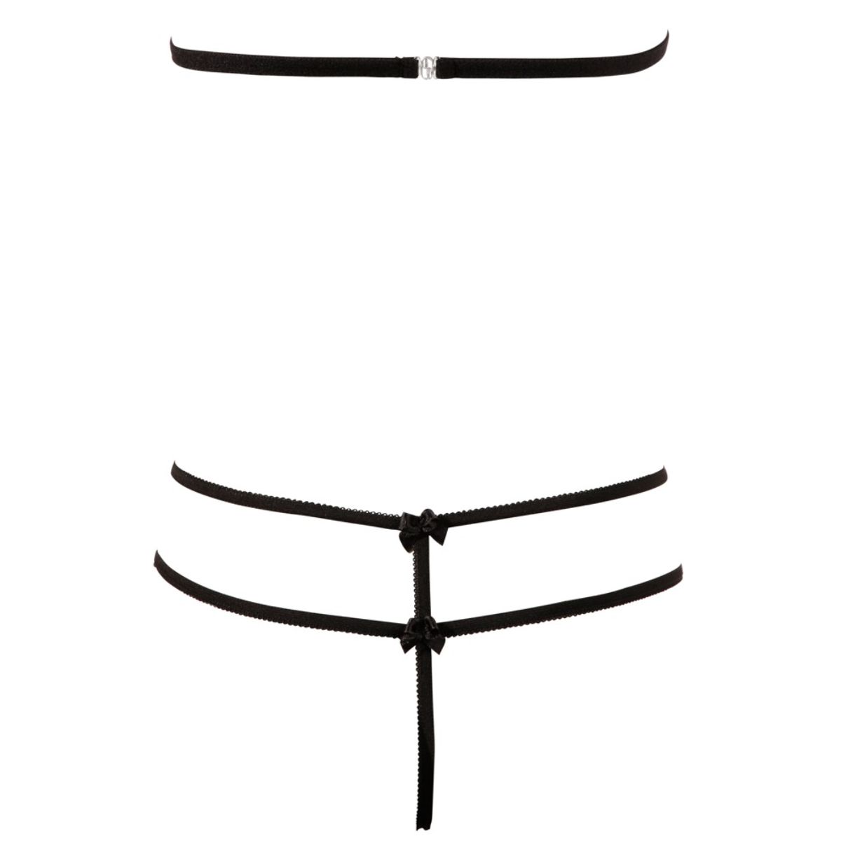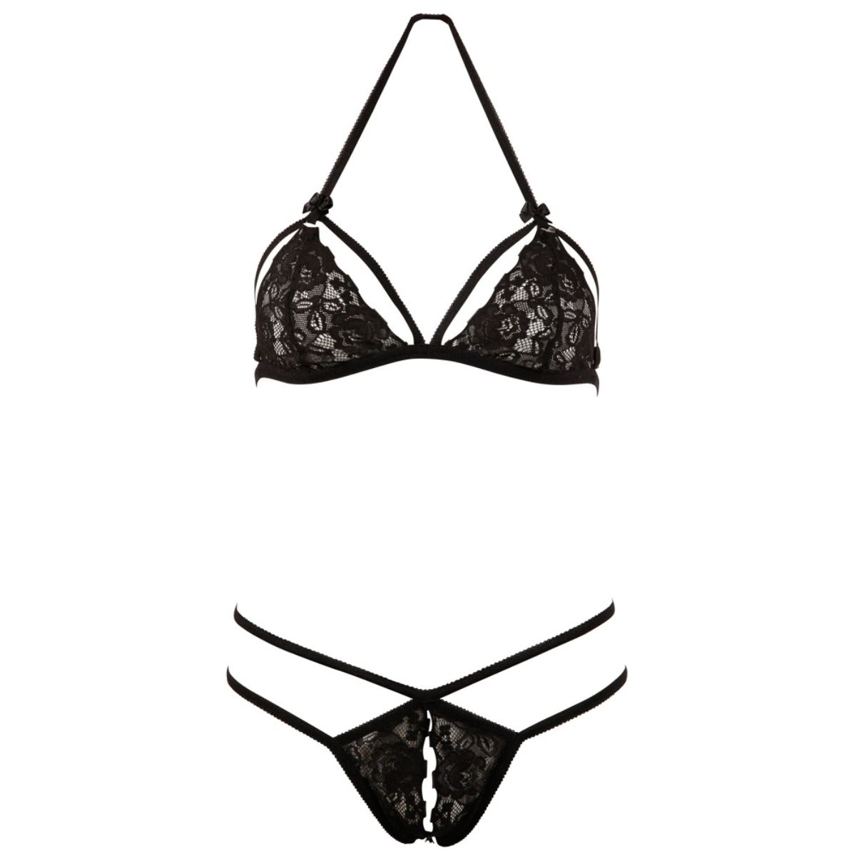 Mooie set met uitneembare cups bh, de string heeft 2 banden die de heupen tekenen en is open bij het kruis. Perfect voor die speciale dag.