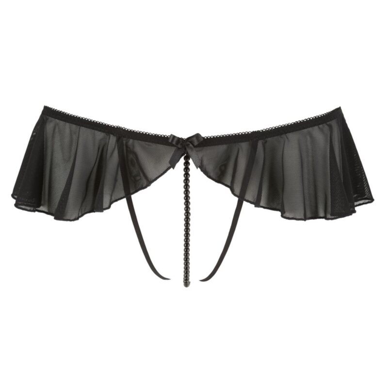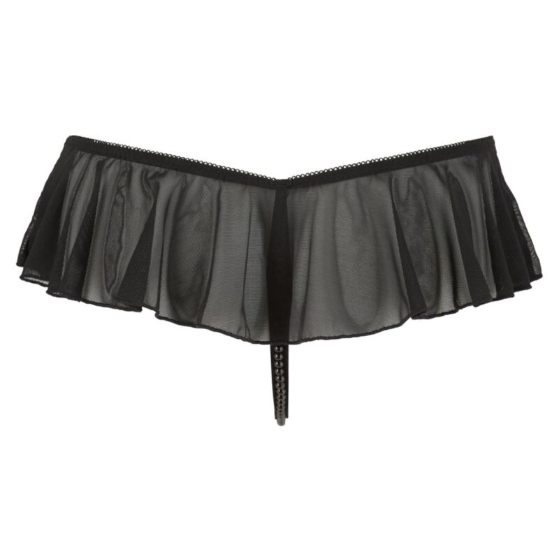 Deze string heeft naast een open kruisje, ook een stimulerende parelketting. Het kanten rokje zorgt voor een spannende look. Dankzij de elastische bandjes is de string comfortabel te dragen.