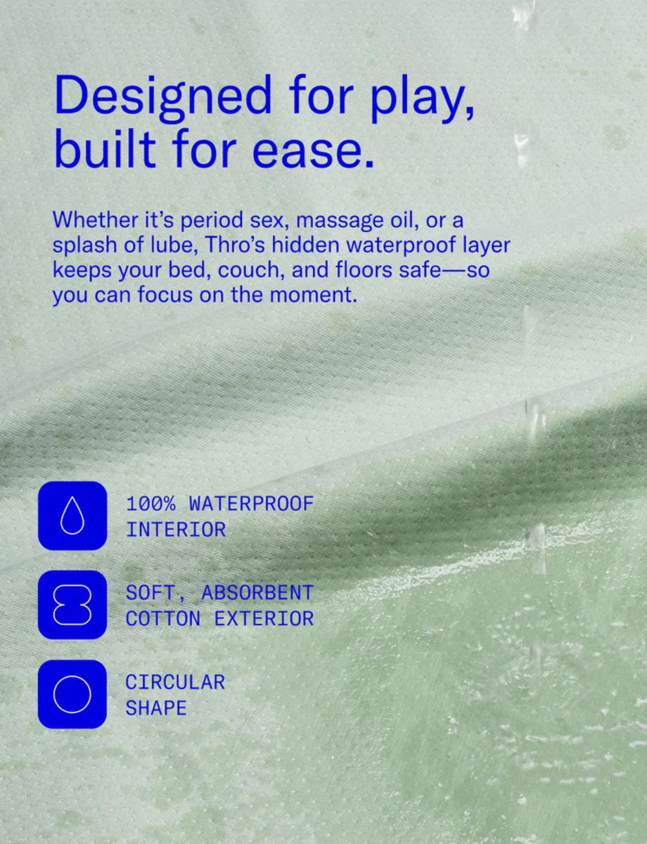 Het Thro speelkleed van DAME is gemaakt van ultra-zacht katoen met een verborgen waterdichte laag die alles schoon houdt. Dankzij de handige pouch is het kleed gemakkelijk mee te nemen. Ademend, compact en veelzijdig, ideaal voor alles van periodsex tot ontbijt op bed of een picknick onder de sterren.