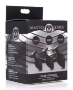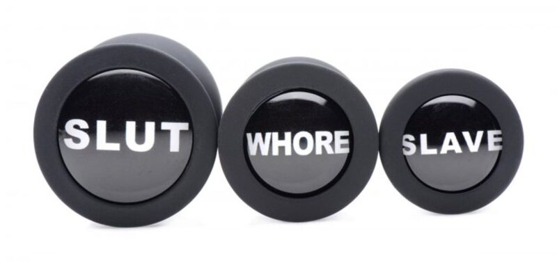 Deze buttplug set heeft drie groottes met taps toelopende punten. Op de onderzijde van elke buttplug staat een Dirty Word zoals ‘Slut’, ‘Whore’ of ‘Slave’. Geef met de buttplug aan hoe je gemoedstoestand is of in wat voor soort spel jij zin hebt. Ze zijn gemakkelijk in te brengen en eenvoudig schoon te maken.