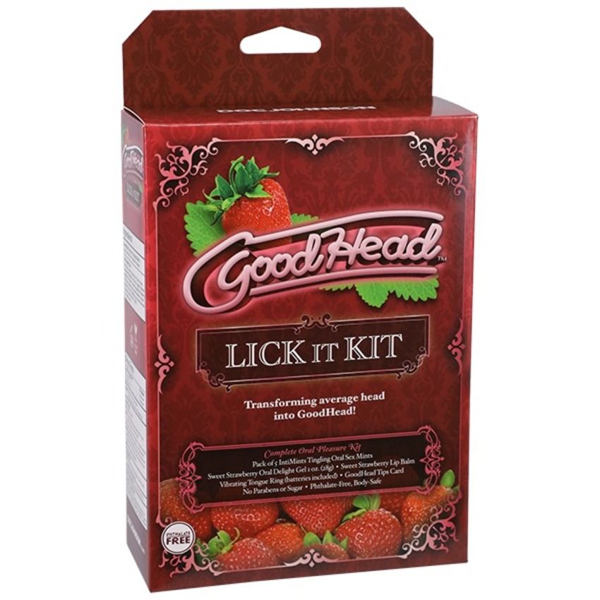 Kit bevat: 29 ml aardbei-gearomatiseerde GoodHead orale gel, een verpakking van 5 tintelende GoodHead orale seksmunten, gearomatiseerde GoodHead lippenbalsem, vibrerende tongring (inclusief 2 knoopcelbatterijen), en GoodHead VOOR HAAR tipskaart.