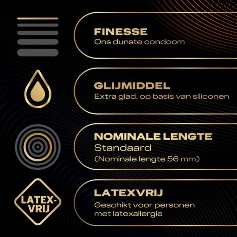 De extra gladde textuur in combinatie met een zacht siliconen glijmiddel verhoogt het comfort en de sensatie, terwijl de nominale breedte van 56 mm een perfecte pasvorm biedt. Geniet van veiligheid en plezier in één met deze innovatieve condooms, ontwikkeld voor een natuurlijk en intens gevoel.