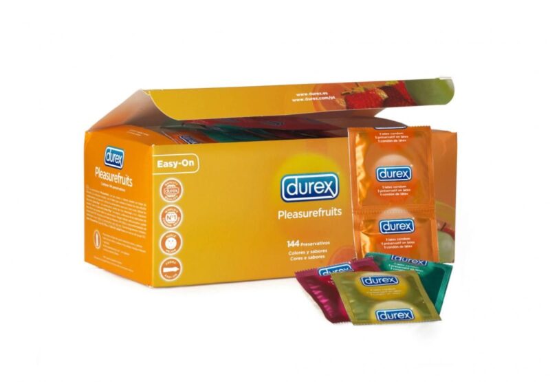 Deze voordelige grootverpakking Durex Pleasurefruits Condooms bevat 144 condooms in 4 verschillende smaken. Het pakket bevat 36 gele banaan-aroma condooms, 36 groene appel-aroma condooms, 36 rode aardbei-aroma condooms en 36 oranje sinaasappel-aroma condooms.