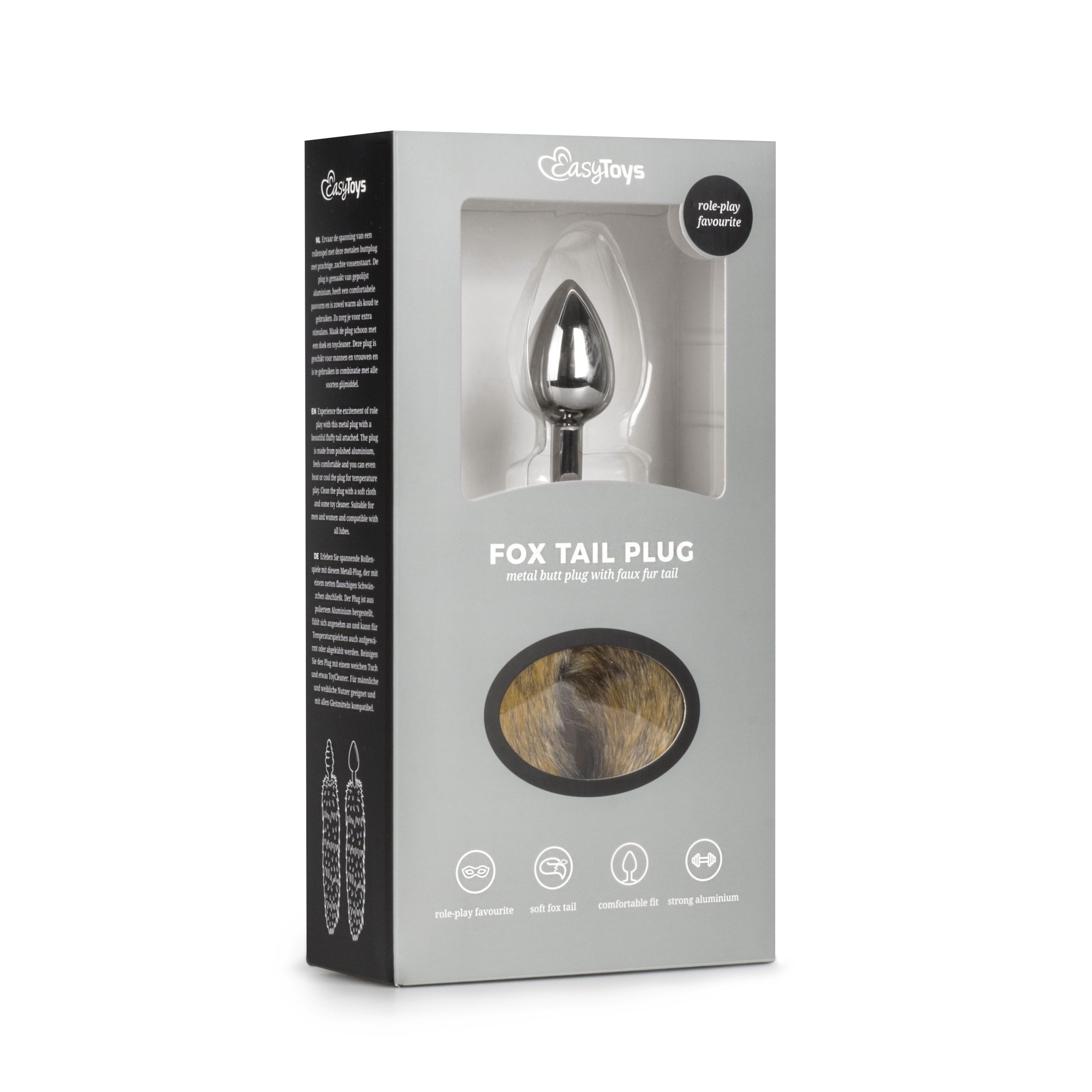 Sexy, zilverkleurige buttplug met gestreepte vossenstaart van EasyToys Fetish Collection. Dit speeltje zorgt voor een heerlijk gevuld gevoel. Het grote formaat is dus perfect voor de gevorderden van anale stimulatie. De gestreepte vossenstaart zwiept bij iedere beweging heen en weer. De vossenstaart maakt deze buttplug perfect voor rollenspellen. Bedenk je eigen favoriete spel en maak bijvoorbeeld gebruik van andere speeltjes, zoals handboeien of een halsband. De gladde buttplug met puntige top voelt heerlijk aan.
