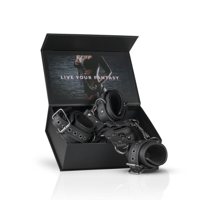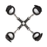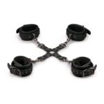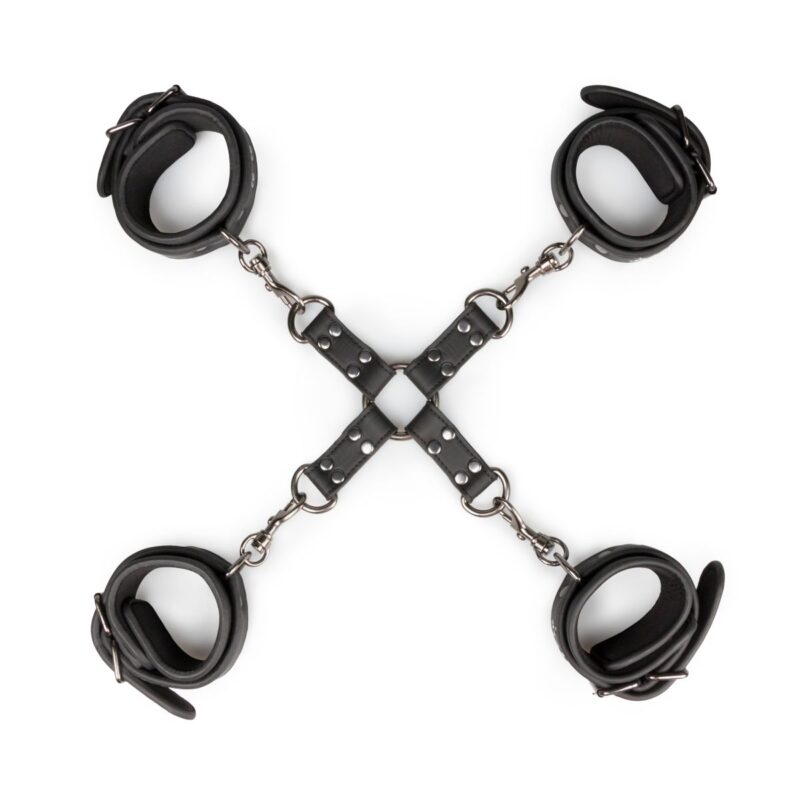 Completeer je bondagespel met deze leuke set. De set bestaat uit handboeien, enkelboeien en een hogtie die op iedere wenselijke manier gebruikt kan worden. De boeien zitten vast aan de hogtie met clipsluitingen zodat je ze makkelijk los kan maken en ze apart kan gebruiken of ze kan bevestigen aan andere bondagespeeltjes zoals harnassen of halsbanden. De boeien en hogtie zijn gemaakt van stevig kunstleer en metaal en zeer duurzaam. De boeien zijn verstelbaar voor een perfecte pasvorm en gevoerd met schuimrubber voor comfortabel gebruik.