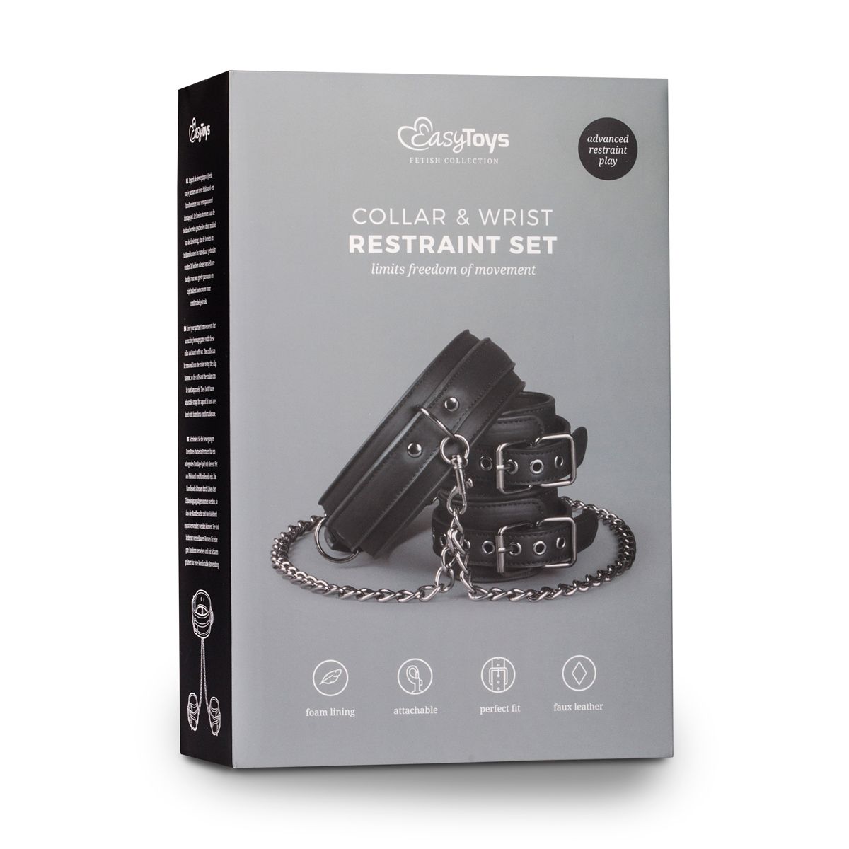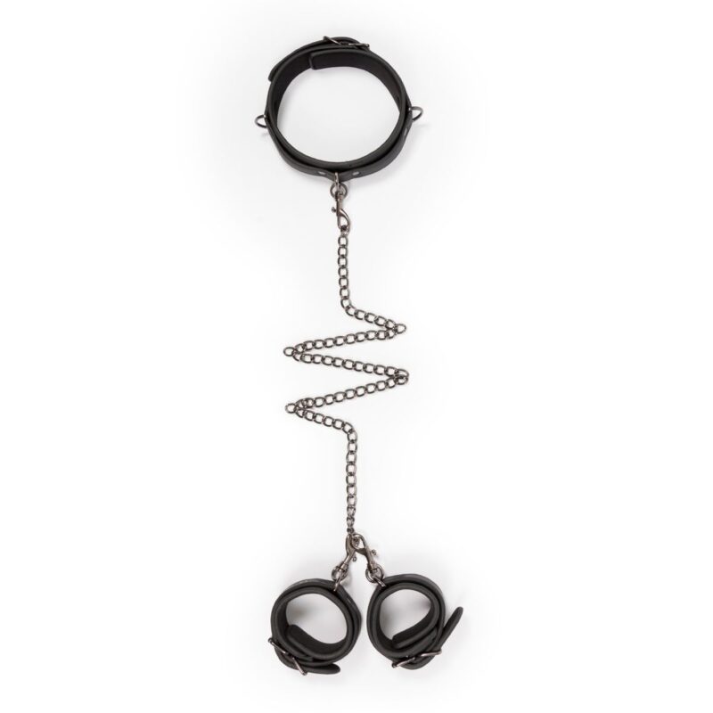 Jij hebt de controle als je sub deze fantastische bondageset draagt! Hij bestaat uit een halsband met handboeien die gemakkelijk van elkaar gescheiden kunnen worden door middel van clipsluitingen. De speeltjes zijn gemaakt van stevig kunstleer gevoerd met schuim, waardoor ze duurzaam zijn en comfortabel om te dragen. De halsband is verstelbaar van 45 tot 58 cm en de boeien zijn verstelbaar van 11 tot 28 cm. Deze set wordt geleverd met 1 ketting met een lengte van 40 cm. Combineer deze speciale set met andere speeltjes, zoals enkelboeien, ball gags, zweepjes en tepelklemmen voor een extra opwindende ervaring.