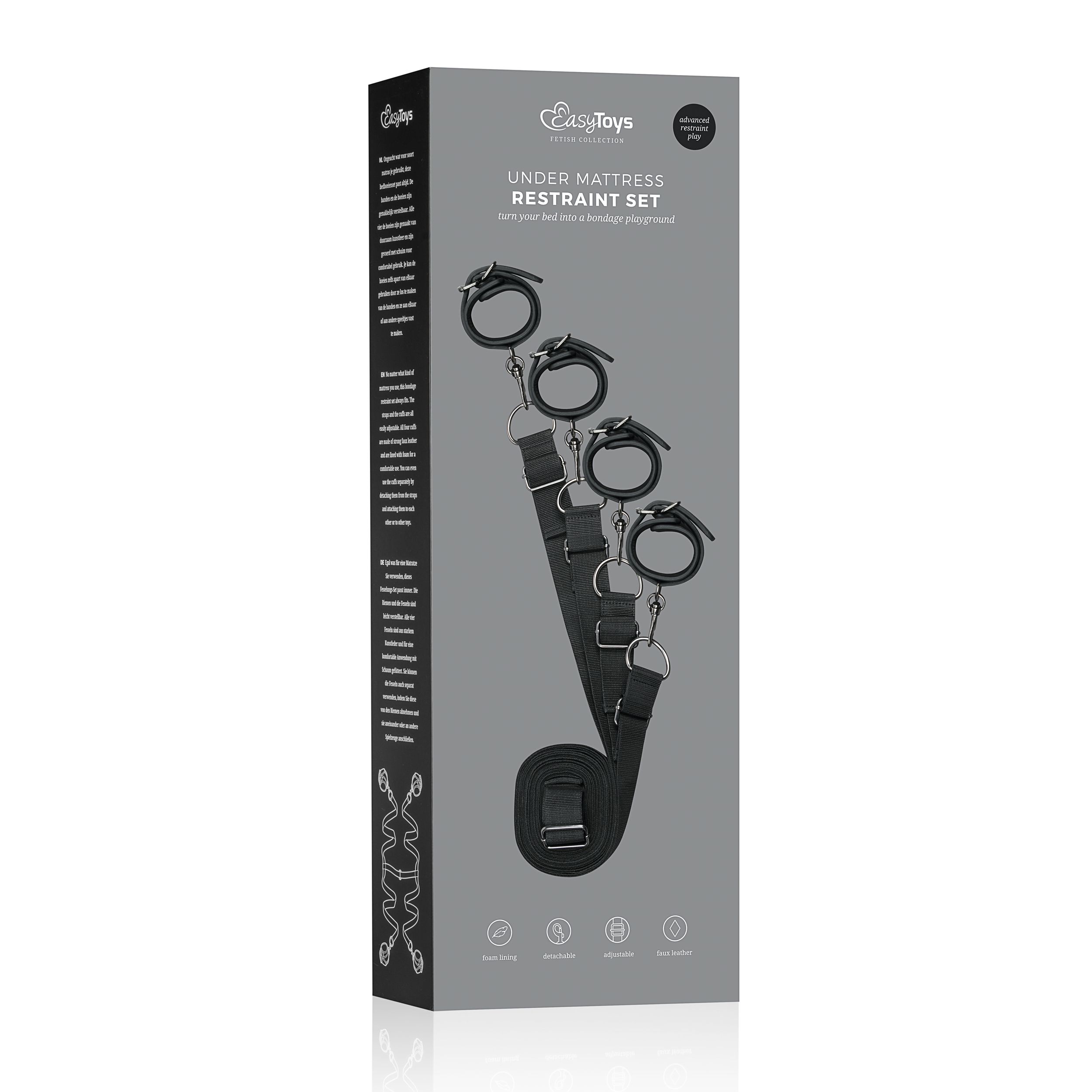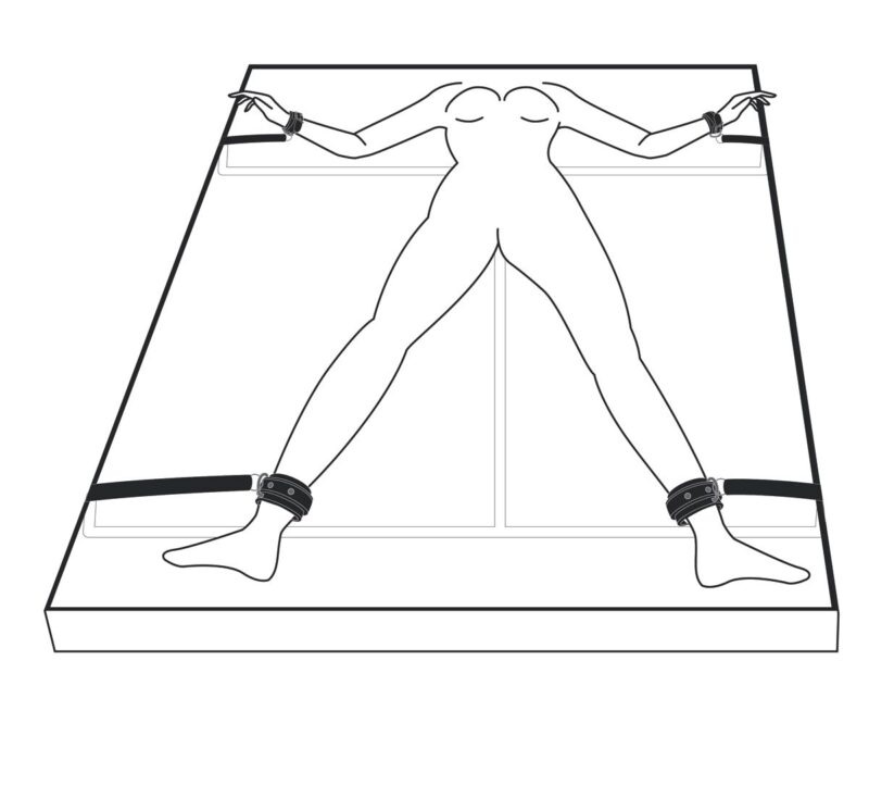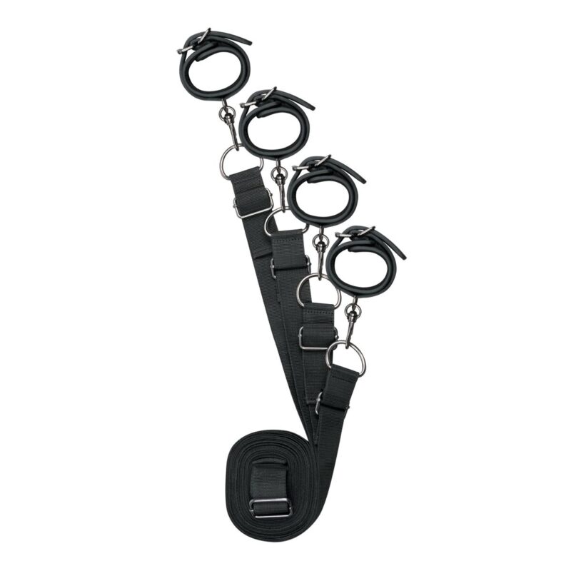 Maak je bondagespel nog opwindender met deze bedboeien. Door de verstelbare banden past dit systeem bij ieder matras. Leg de banden onder je matras en laat de boeien er aan de zijkanten uit hangen. Dan laat je je partner op bed liggen en bind je zijn of haar handen en enkels vast met de boeien. Ontsnappen is onmogelijk. Alle vier de boeien zijn verstelbaar voor een perfecte pasvorm. Ze zijn gemaakt van stevig en duurzaam kunstleer en zijn gevoerd met schuimrubber voor een comfortabel gebruik.