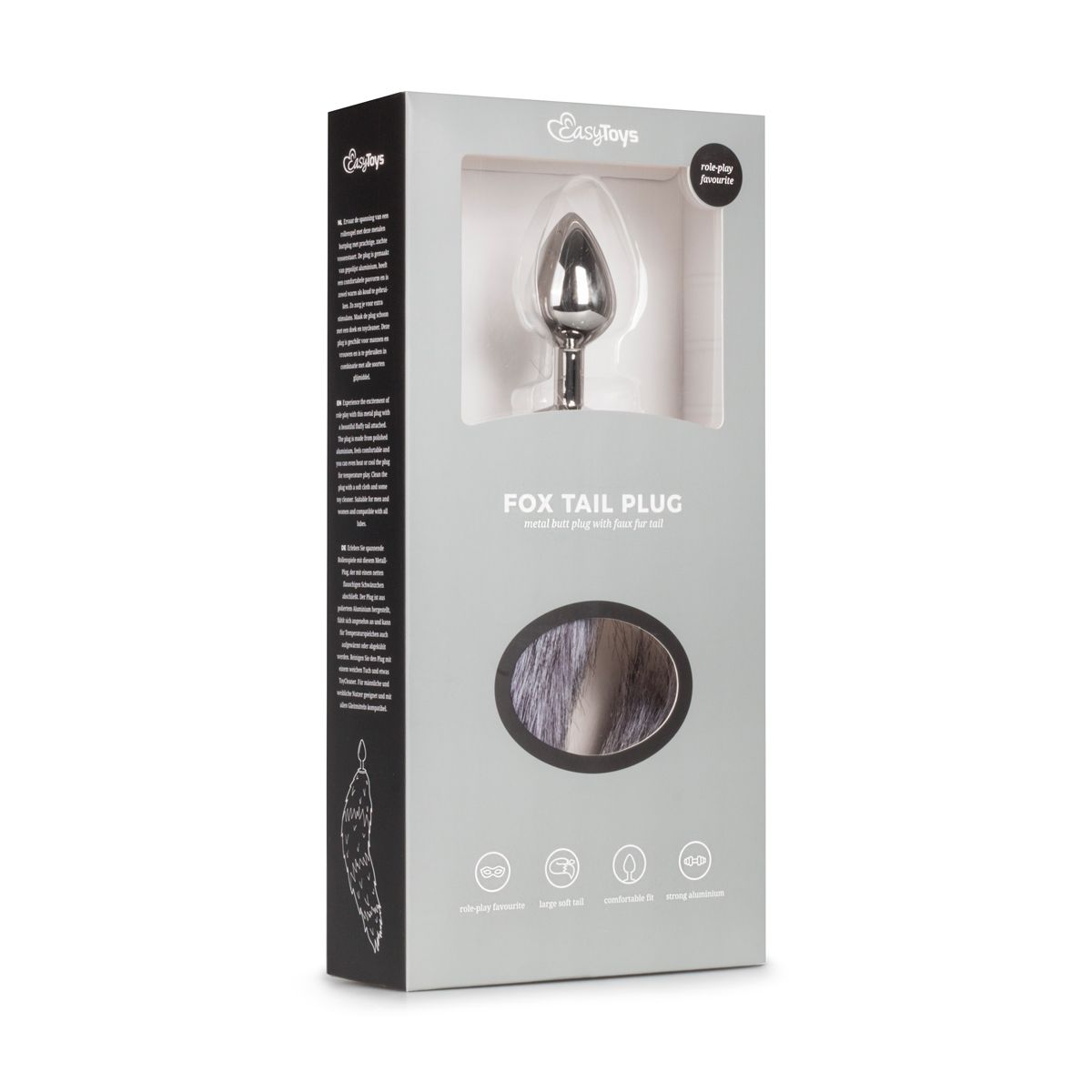 Erotische, zilverkleurige buttplug met vossenstaart van EasyToys Fetish Collection. Als je klaar bent voor een wilde nacht, dan ben je klaar voor dit medium speeltje. De zilverkleurige buttplug van aluminium heeft een gladde en ronde vorm met een puntige top. Het speeltje is makkelijk in te brengen en te verwijderen. De vossenstaart is dik en vol van structuur en zorgt voor een luxueus uiterlijk. Ben jij klaar voor een beestachtig rollenspel?