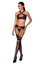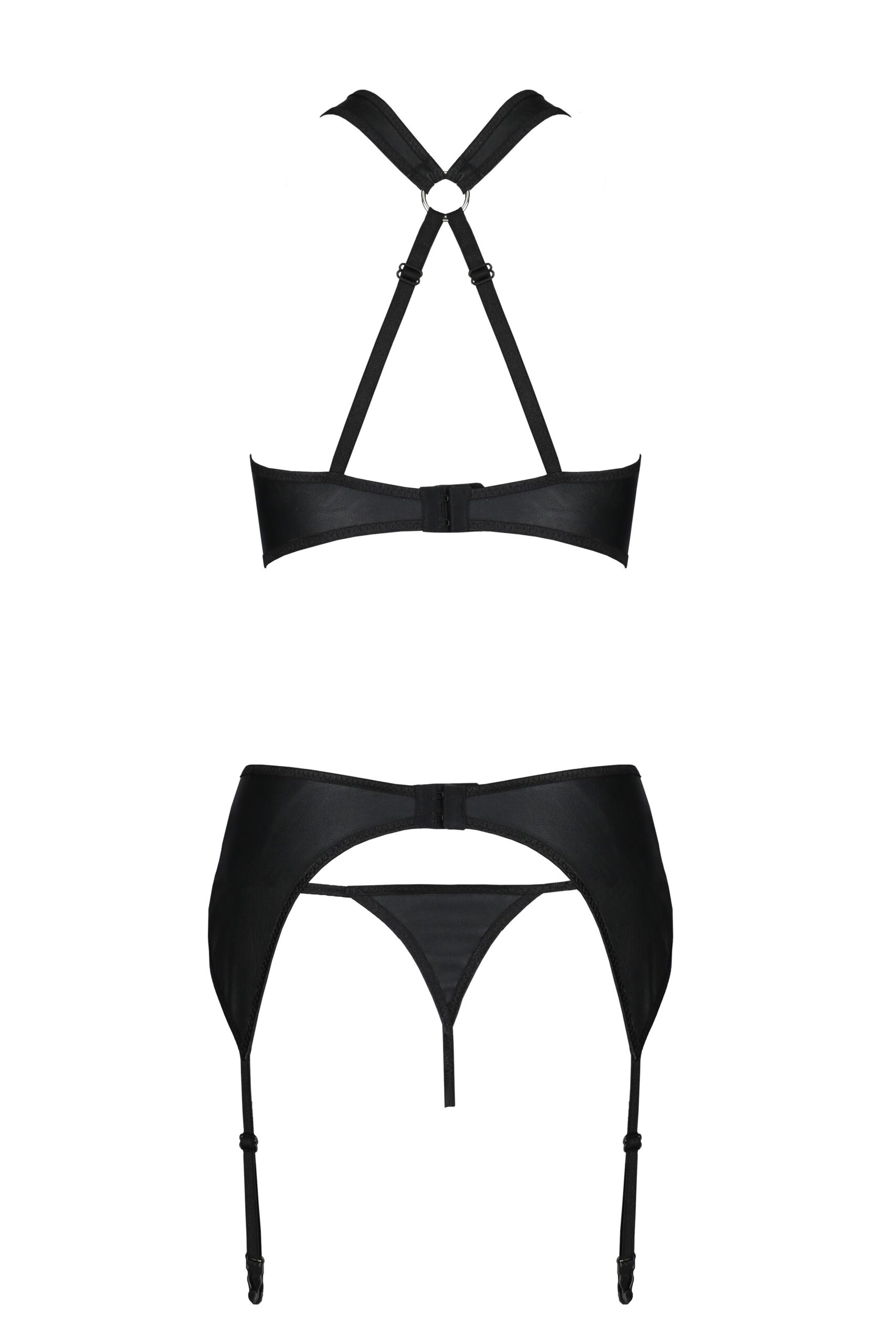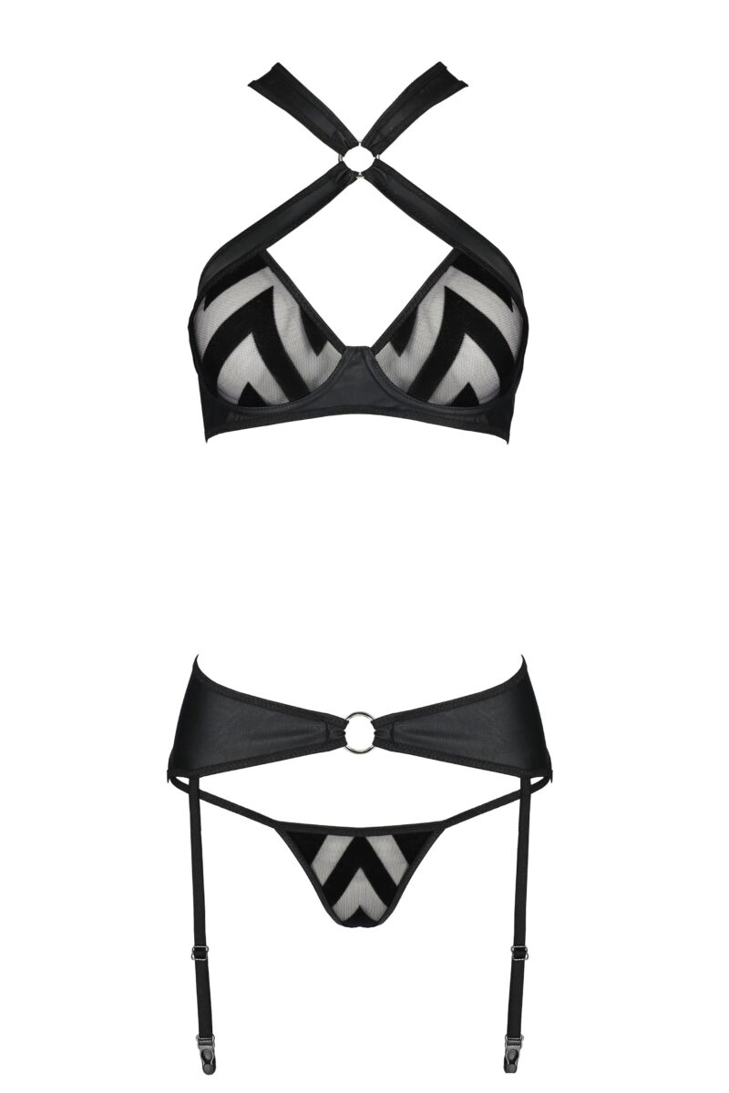 Een extravagante en exclusieve set bestaande uit een bh, string en jarretelgordel. Tijdloos leerlook en materiaal met flock-print zijn een originele combinatie die altijd en elke vrouw goed staan.