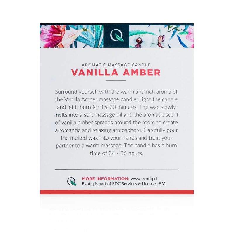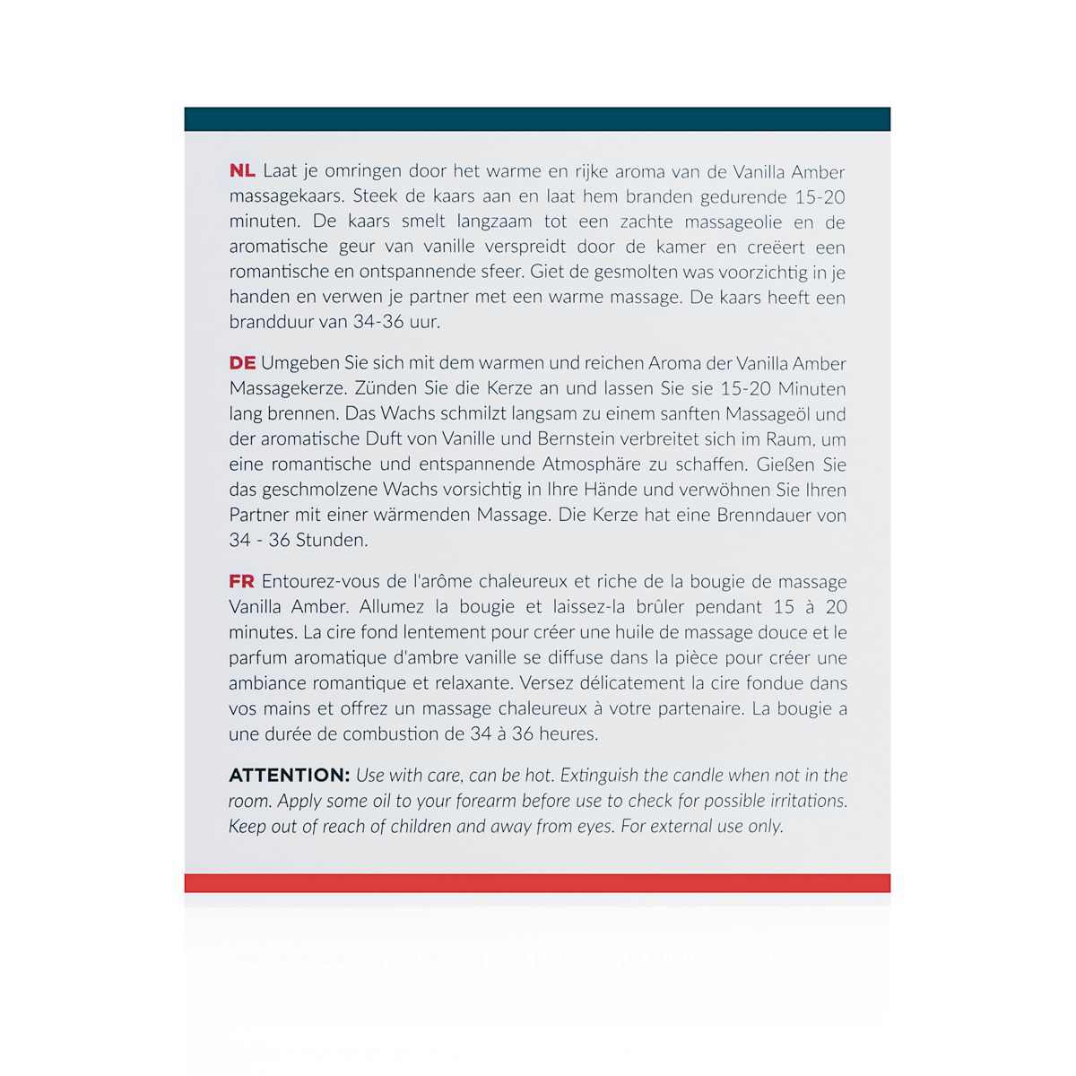 Laat je masseren of masseer je partner met deze Exotiq massagekaars. Steek de kaars aan en geniet van de heerlijke vanille- en ambergeur die zich door de kamer verspreidt. Laat de kaars 15-20 minuten branden en giet dan voorzichtig het gesmolten kaarsvet in je handen. Gebruik deze warme massageolie om je partner te verwennen met een ontspannende massage.