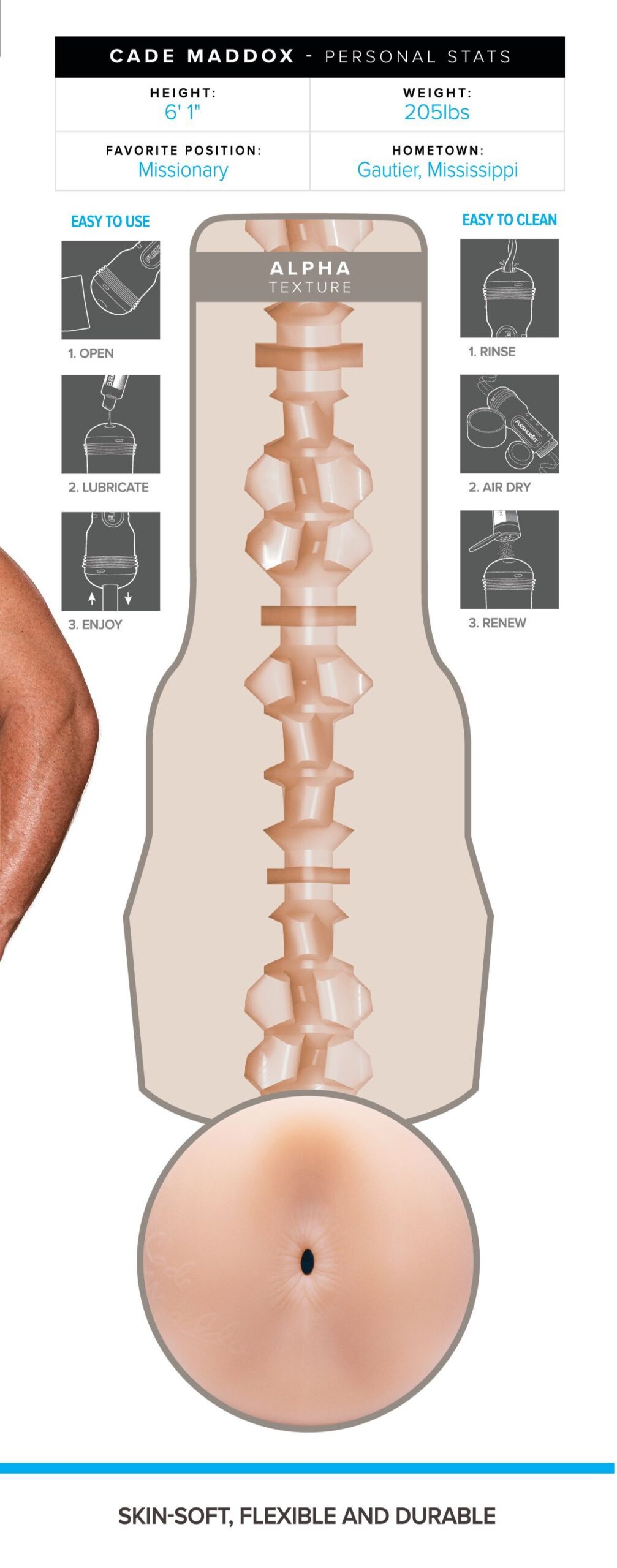 Laat je verwennen door Cade Maddox, een heerlijke masturbator met anus opening die gemodelleerd is naar de bekende pornoster. De Fleshjack Boys serie staat bekend om zijn discrete vormgeving en doet zijn naam eer aan. De uitneembare sleeve is gemaakt van SuperSkin, een lichaamsveilig siliconen dat enorm zacht en comfortabel aanvoelt. Groot voordeel is dat dit materiaal snel op temperatuur is. De binnenkant is voorzien van noppen en ribbels en de verschillende ‘kamers” hebben ieder een eigen structuur. Met de dop aan de achterzijde stel je het gewenste vacuüm in. De totale combinatie geeft een zeer realistisch en intens gevoel en zorgt voor een heerlijke ervaring. De opening is flexibel en past zich volledig aan de grootte van jouw penis. Door de plastic behuizing heb je altijd een goede grip op de masturbator. De sleeve kun je makkelijk schoonmaken en dat maakt de Fleshjack een ideale toy voor oneindig plezier.