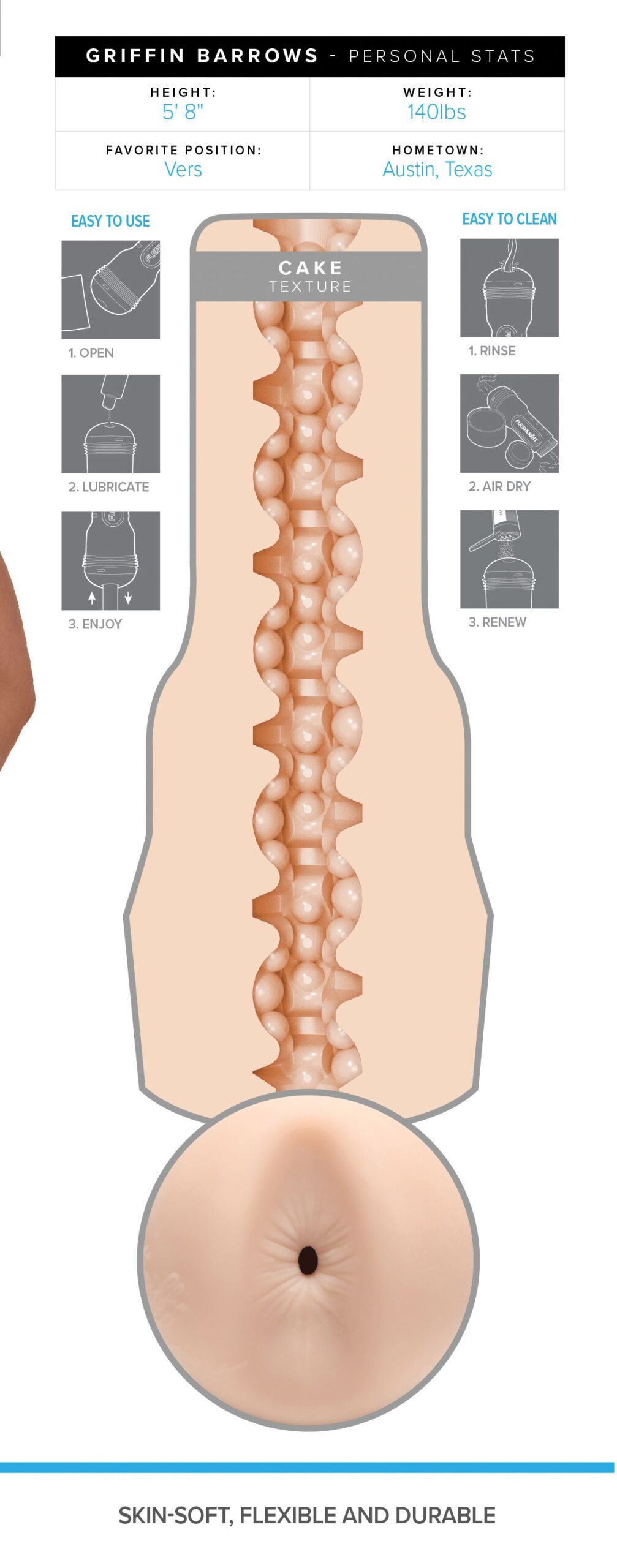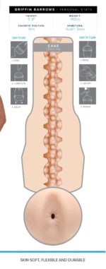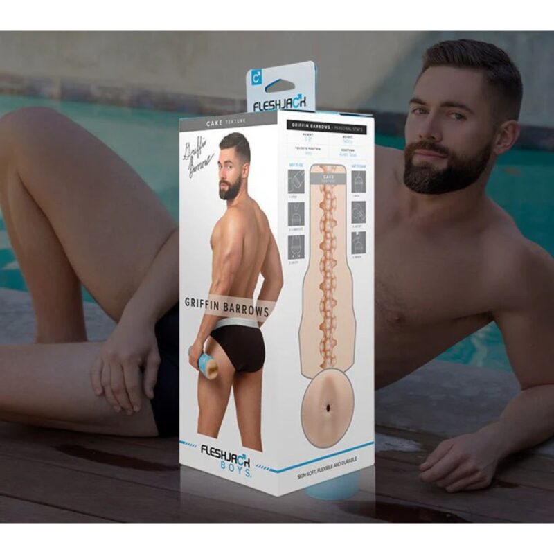 Laat je verwennen door Griffin Barrows, een heerlijke masturbator met anus opening die gemodelleerd is naar de bekende pornoster. De Fleshjack Boys serie staat bekend om zijn discrete vormgeving en doet zijn naam eer aan. De uitneembare sleeve is gemaakt van SuperSkin, een lichaamsveilig siliconen dat enorm zacht en comfortabel aanvoelt. Groot voordeel is dat dit materiaal snel op temperatuur is. De binnenkant is voorzien van noppen en ribbels en de verschillende ‘kamers” hebben ieder een eigen structuur. Met de dop aan de achterzijde stel je het gewenste vacuüm in. De totale combinatie geeft een zeer realistisch en intens gevoel en zorgt voor een heerlijke ervaring. De opening is flexibel en past zich volledig aan de grootte van jouw penis. Door de plastic behuizing heb je altijd een goede grip op de masturbator. De sleeve kun je makkelijk schoonmaken en dat maakt de Fleshjack een ideale toy voor oneindig plezier.