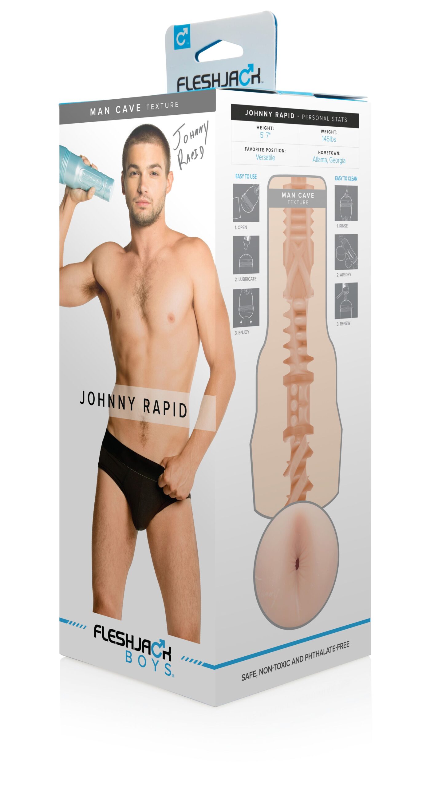 Laat je verwennen door Johnny Rapid, een heerlijke masturbator met anus opening die gemodelleerd is naar de bekende pornoster. De Fleshjack Boys serie staat bekend om zijn discrete vormgeving en doet zijn naam eer aan. De uitneembare sleeve is gemaakt van SuperSkin, een lichaamsveilig siliconen dat enorm zacht en comfortabel aanvoelt. Groot voordeel is dat dit materiaal snel op temperatuur is tijdens het gebruik. De binnenkant is voorzien van noppen en ribbels en de verschillende ‘kamers” hebben ieder een eigen structuur. Met de dop aan de achterzijde stel je het gewenste vacuüm in. De totale combinatie geeft een zeer realistisch en intens gevoel en zorgt voor een heerlijke ervaring. De opening is flexibel en past zich volledig aan aan de grootte van jouw penis. Door de plastic behuizing heb je altijd een goede grip op de masturbator. De sleeve kun je eenvoudig schoonmaken en dat maakt de Fleshjack een ideale toy voor oneindig plezier!