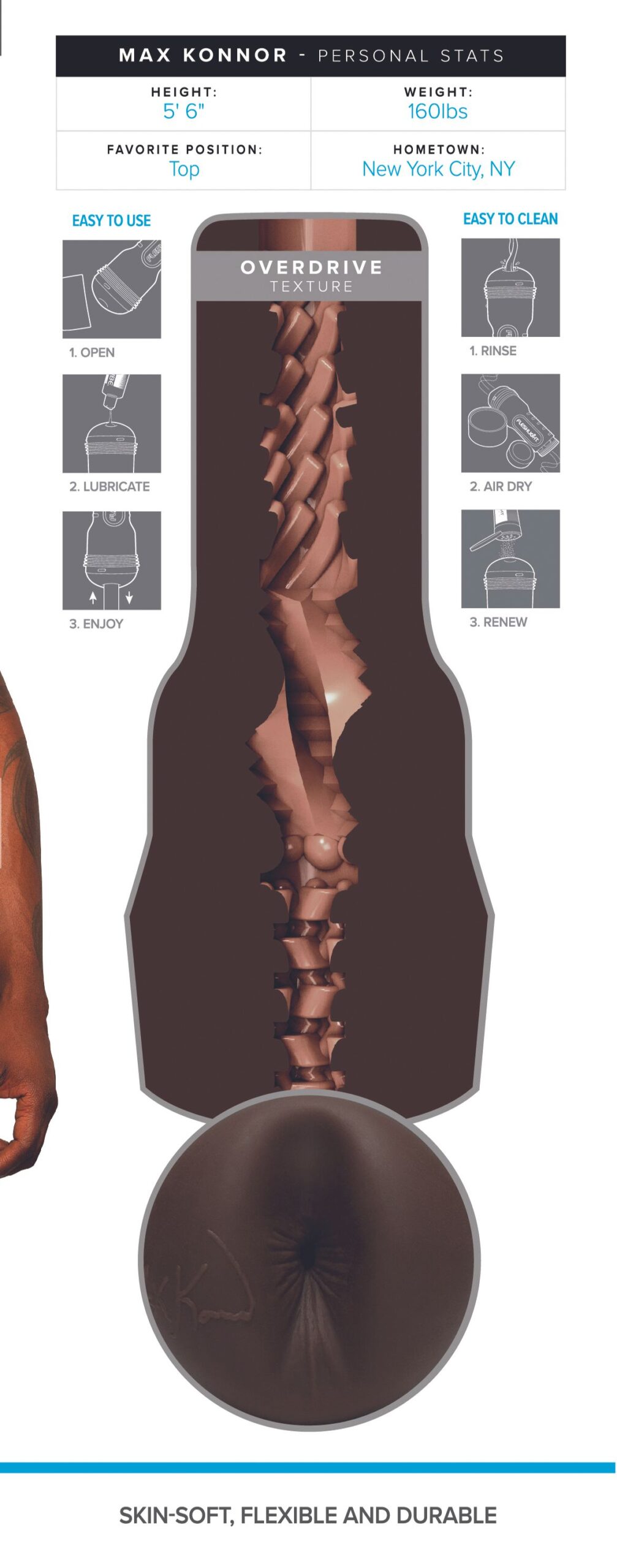 Laat je verwennen door Max Konnor, een heerlijke masturbator met anus opening die gemodelleerd is naar de bekende pornoster. De Fleshjack Boys serie staat bekend om zijn discrete vormgeving en doet zijn naam eer aan. De uitneembare sleeve is gemaakt van SuperSkin, een lichaamsveilig siliconen dat enorm zacht en comfortabel aanvoelt. Groot voordeel is dat dit materiaal snel op temperatuur is. De binnenkant is voorzien van noppen en ribbels en de verschillende ‘kamers” hebben ieder een eigen structuur. Met de dop aan de achterzijde stel je het gewenste vacuüm in. De totale combinatie geeft een zeer realistisch en intens gevoel en zorgt voor een heerlijke ervaring. De opening is flexibel en past zich volledig aan de grootte van jouw penis. Door de plastic behuizing heb je altijd een goede grip op de masturbator. De sleeve kun je makkelijk schoonmaken en dat maakt de Fleshjack een ideale toy voor oneindig plezier.