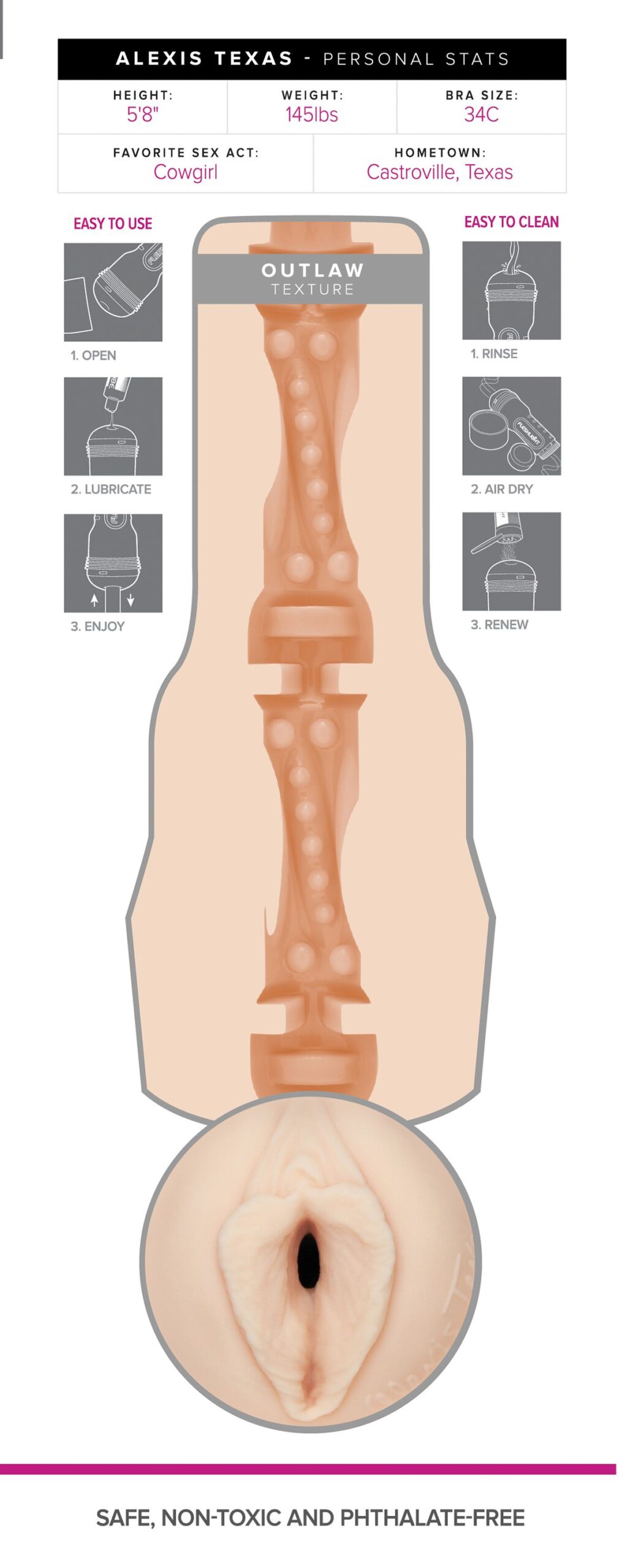 Laat je verwennen door Alexis Texas Outlaw, een heerlijke Fleshlight die gemodelleerd is naar de bekende pornoster. De Fleshlight serie staat bekend om zijn discrete vormgeving en doet zijn naam eer aan. De uitneembare sleeve is gemaakt van SuperSkin, een lichaamsveilig siliconen dat enorm zacht en comfortabel aanvoelt. Groot voordeel is dat dit materiaal snel op temperatuur is. De binnenkant is voorzien van noppen en ribbels en de verschillende ‘kamers" hebben ieder een eigen structuur. Met de dop aan de achterzijde stel je het gewenste vacuüm in. De totale combinatie geeft een zeer realistisch en intens gevoel en zorgt voor een heerlijke ervaring. De opening is flexibel en past zich volledig aan de grootte van jouw penis. Door de plastic behuizing heb je altijd een goede grip op de masturbator. De sleeve kun je makkelijk schoonmaken en dat maakt de Fleshlight een ideale toy voor oneindig plezier. Gebruik een glijmiddel op waterbasis.