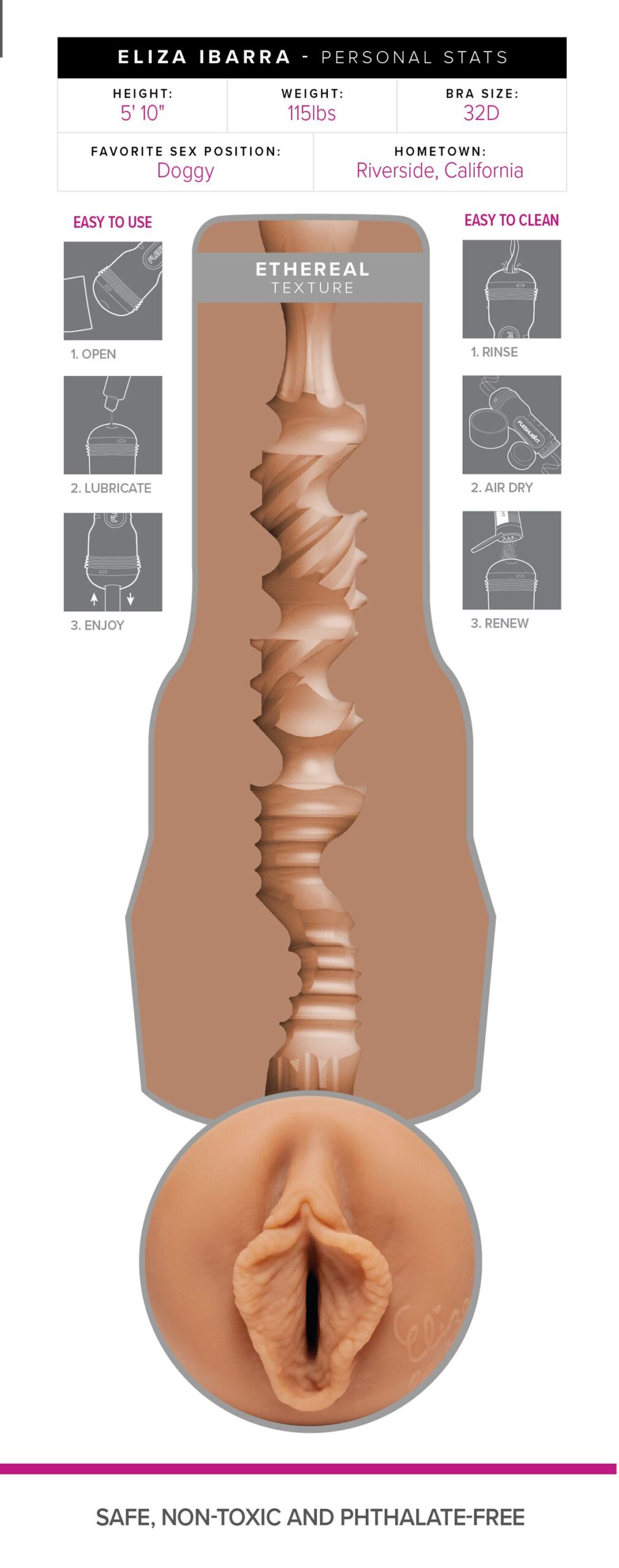Laat je verwennen door Eliza Ibarra, een heerlijke Fleshlight die gemodelleerd is naar de bekende pornoster. De Fleshlight serie staat bekend om zijn discrete vormgeving en doet zijn naam eer aan. De uitneembare sleeve is gemaakt van SuperSkin, een lichaamsveilig siliconen dat enorm zacht en comfortabel aanvoelt. Groot voordeel is dat dit materiaal snel op temperatuur is. De binnenkant is voorzien van noppen en ribbels en de verschillende ‘kamers” hebben ieder een eigen structuur. Met de dop aan de achterzijde stel je het gewenste vacuüm in. De totale combinatie geeft een zeer realistisch en intens gevoel en zorgt voor een heerlijke ervaring. De opening is flexibel en past zich volledig aan de grootte van jouw penis. Door de plastic behuizing heb je altijd een goede grip op de masturbator. De sleeve kun je makkelijk schoonmaken en dat maakt de Riley Reid Fleshlight een ideale toy voor oneindig plezier. Gebruik een glijmiddel op waterbasis.