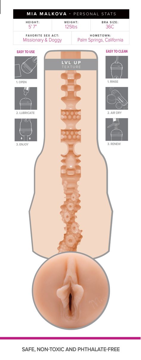Laat je verwennen door Mia Malkova LVL UP, een heerlijke Fleshlight die gemodelleerd is naar de bekende pornoster. De Fleshlight serie staat bekend om zijn discrete vormgeving en doet zijn naam eer aan. De uitneembare sleeve is gemaakt van SuperSkin, een lichaamsveilig siliconen dat enorm zacht en comfortabel aanvoelt. Groot voordeel is dat dit materiaal snel op temperatuur is. De binnenkant is voorzien van noppen en ribbels en de verschillende ‘kamers” hebben ieder een eigen structuur. Met de dop aan de achterzijde stel je het gewenste vacuüm in. De totale combinatie geeft een zeer realistisch en intens gevoel en zorgt voor een heerlijke ervaring. De opening is flexibel en past zich volledig aan de grootte van jouw penis. Door de plastic behuizing heb je altijd een goede grip op de masturbator. De sleeve kun je makkelijk schoonmaken en dat maakt de Fleshlight een ideale toy voor oneindig plezier. Gebruik een glijmiddel op waterbasis.