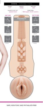 Laat je verwennen door Stoya Destroya, een heerlijke Fleshlight die gemodelleerd is naar de bekende pornoster. De Fleshlight serie staat bekend om zijn discrete vormgeving en doet zijn naam eer aan. De uitneembare sleeve is gemaakt van SuperSkin, een lichaamsveilig siliconen dat enorm zacht en comfortabel aanvoelt. Groot voordeel is dat dit materiaal snel op temperatuur is. De binnenkant is voorzien van noppen en ribbels en de verschillende ‘kamers” hebben ieder een eigen structuur. Met de dop aan de achterzijde stel je het gewenste vacuüm in. De totale combinatie geeft een zeer realistisch en intens gevoel en zorgt voor een heerlijke ervaring. De opening is flexibel en past zich volledig aan de grootte van jouw penis. Door de plastic behuizing heb je altijd een goede grip op de masturbator. De sleeve kun je makkelijk schoonmaken en dat maakt de Fleshlight een ideale toy voor oneindig plezier. Gebruik een glijmiddel op waterbasis.