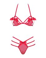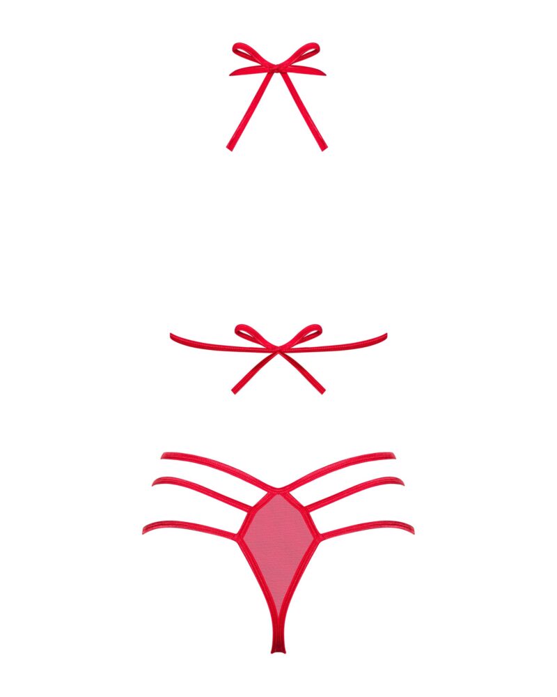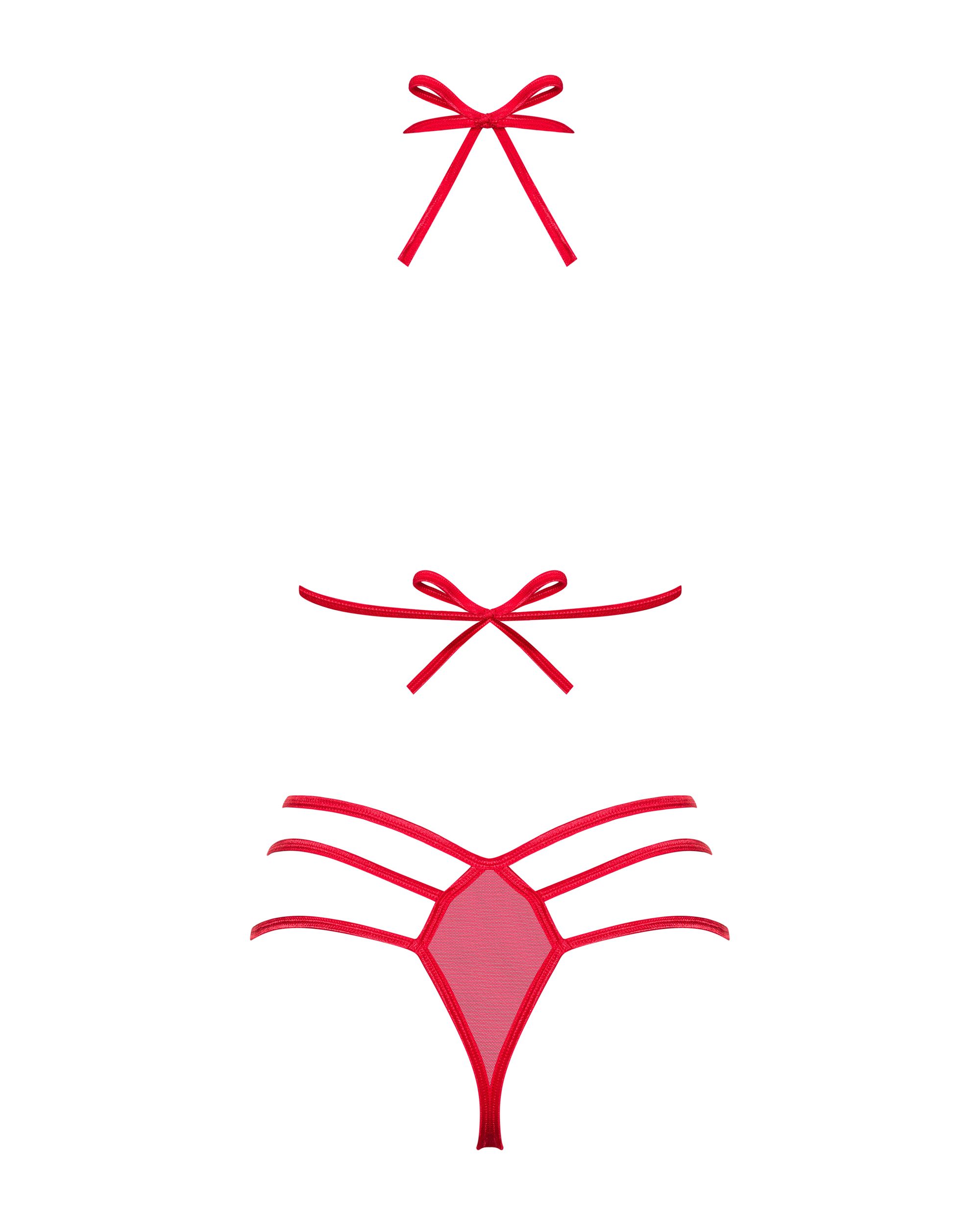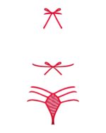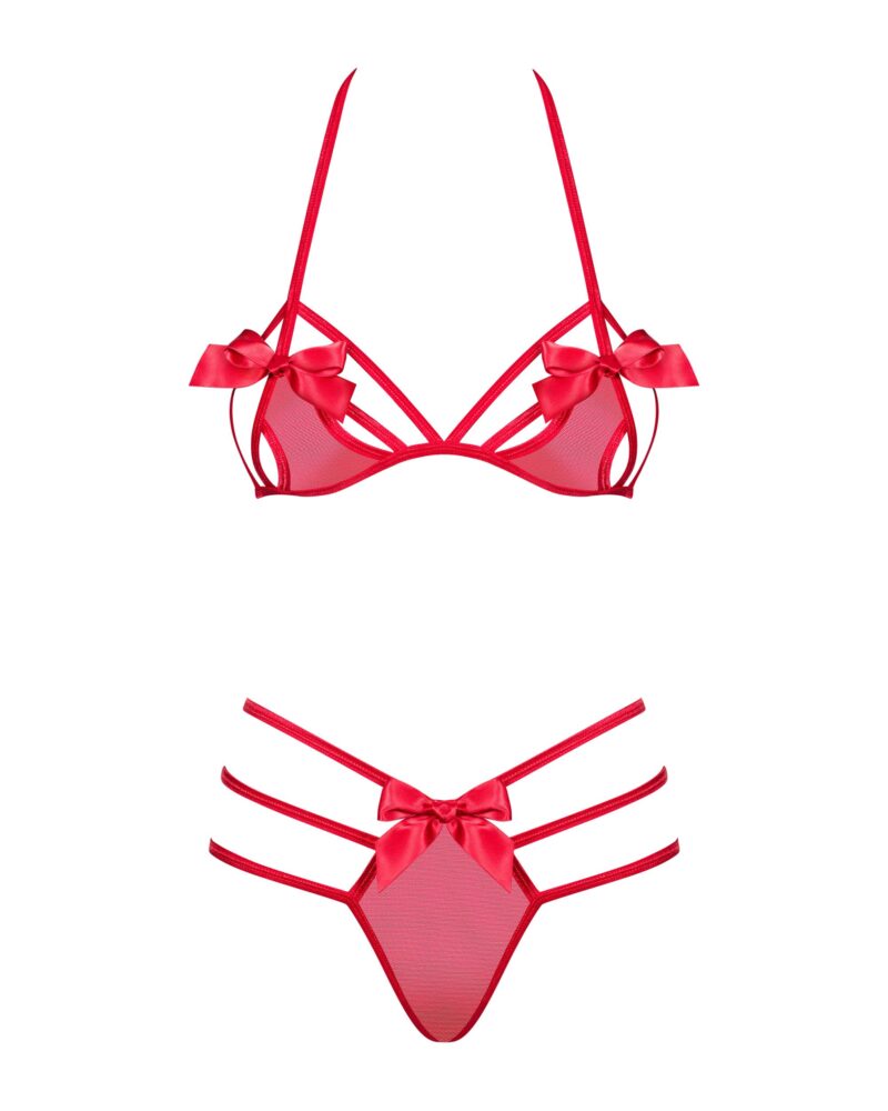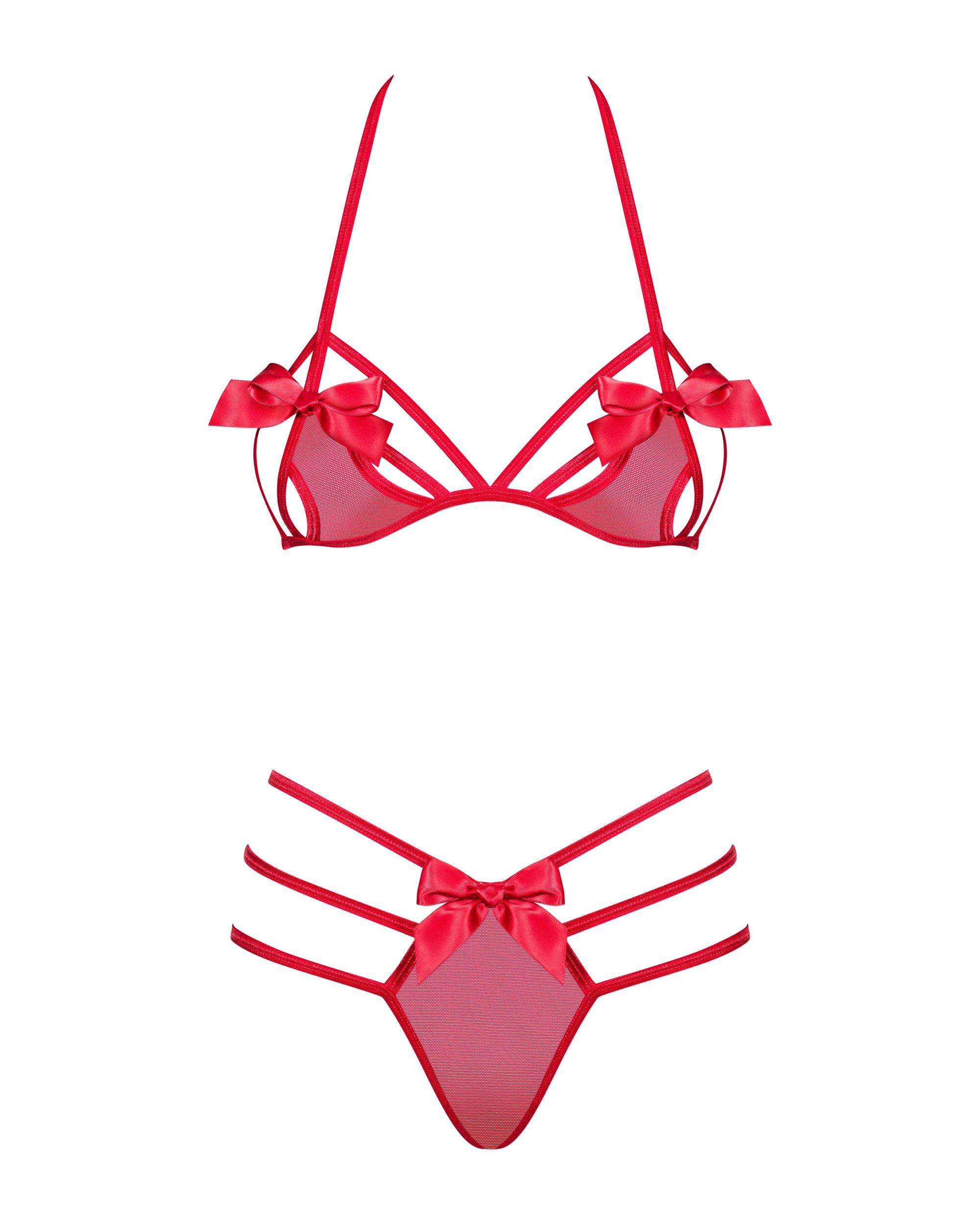 Deze verleidelijke rode BH-set heeft cups met openingen en speelse strikjes. De bijpassende slip heeft meerdere elastische bandjes aan de achterkant die jouw billen er prachtig uit laten zien.