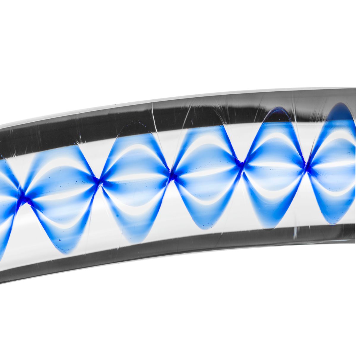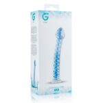 Deze dildo is gemaakt van glas. Het glas is transparant en heeft een blauwe spiraal in het midden voor een unieke look. Glas is een sterk, hygiënisch materiaal dat erg glad aanvoelt. Daarnaast kan het gebruikt worden met elk glijmiddel. De dildo heeft een platte voet en is daardoor veilig te gebruiken voor anale penetratie. De licht gebogen schacht maakt het mogelijk om de G-spot en P-spot te stimuleren.