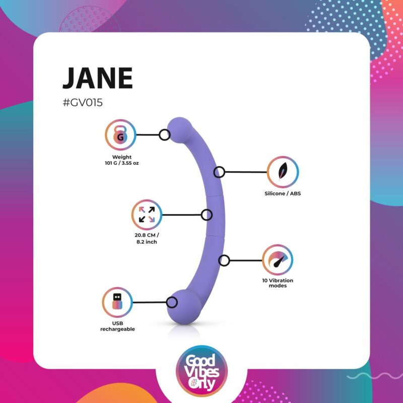 Good Vibes Only biedt hoogwaardige materialen en een krachtige motor, waardoor je een ongekende climax zult ervaren! Het is geschikt voor gebruik op elk plekje waar je die positieve vibraties wilt voelen. Pas het tempo aan naar jouw wensen, of je nu liever rustig aan doet of juist wat meer intensiteit zoekt. En als je vibraties op raken, laad je de vibrator gewoon weer op voor een nieuwe ronde van intens genot! Jane heeft een zijdezachte siliconen schacht en biedt 10 krachtige vibratiestanden. Reinig na gebruik eenvoudig met lauwwarm water en een toycleaner.