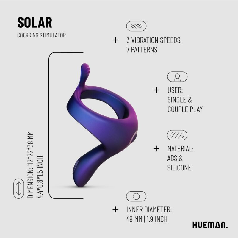 Deze vibrerende cockring van Hueman mag niet ontbreken in je collectie. Doordat de ring de bloedtoevoer beperkt zorgt dit voor meer genot, een sterkere, en langdurige erectie, en als hoogtepunt een intenser orgasme. Daarnaast kan het uitstekende vibrerende gedeelte op het perineum of op de schacht geplaatst worden voor extra stimulatie tijdens de seks.