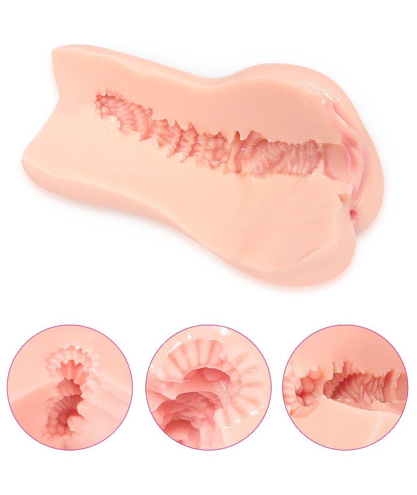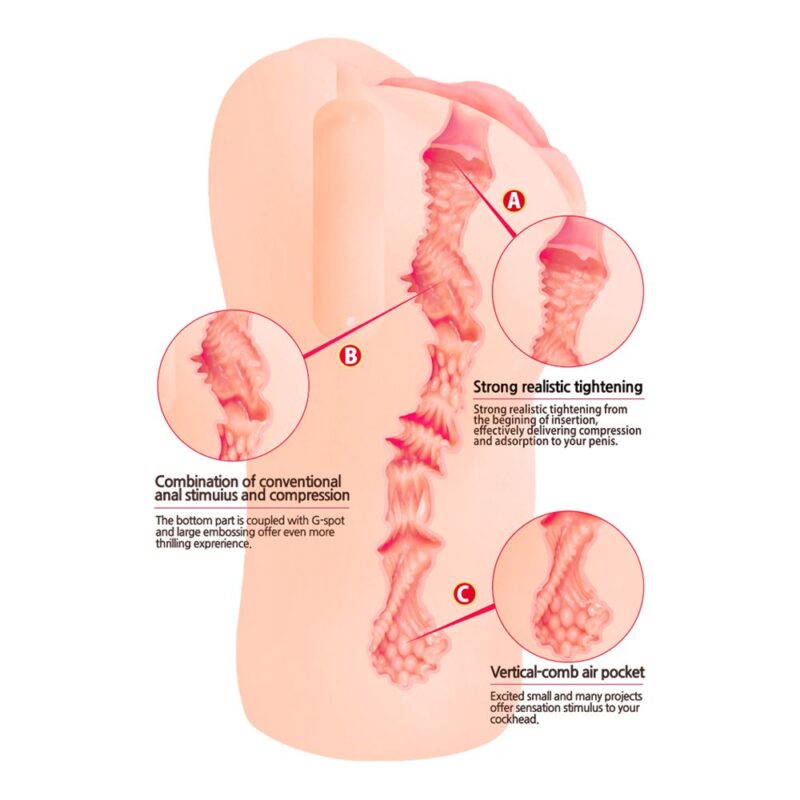 De buiten laag is zacht en huidachtig, terwijl de binnenste laag een strakkere en stevigere sensatie biedt, wat zorgt voor een intens stimulerende ervaring. De geavanceerde interne structuur, gebaseerd op een echte vagina in opgewonden staat, is zorgvuldig ontworpen om maximale stimulatie te bieden bij elke beweging. De onahole is voorzien van realistische zachte schaamlippen en een opgezwollen G-spot.