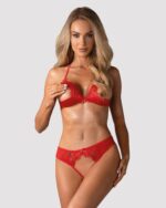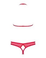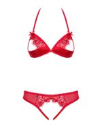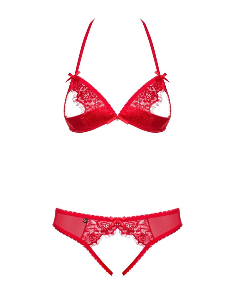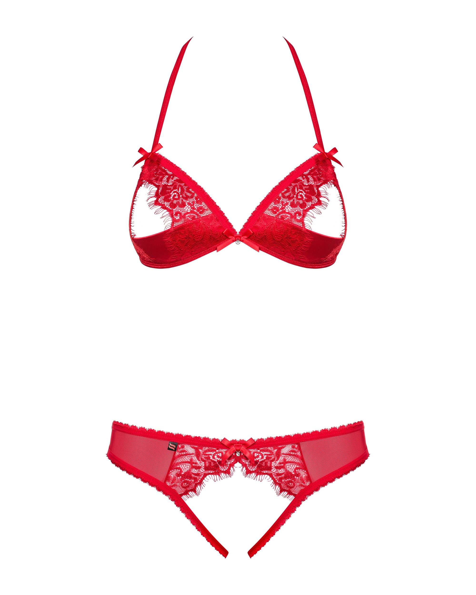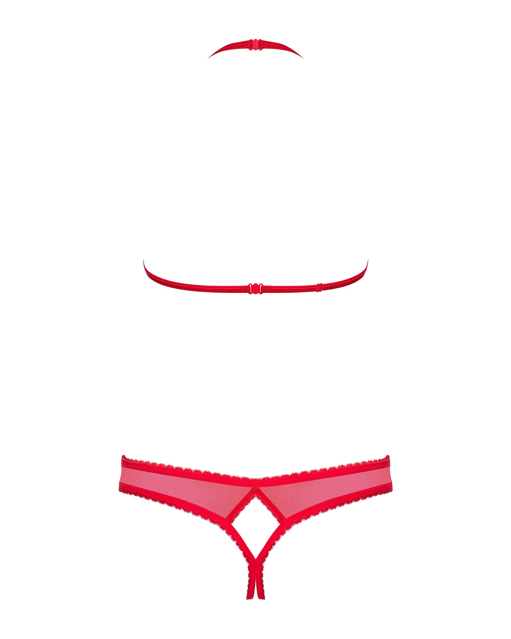 Een verleidelijke tweedelige set die je vrouwelijke vormen prachtig accentueert en een speelse sensualiteit uitstraalt. Deze set omvat een BH met open cups en een kruisloze string, beide voorzien van verstelbare bandjes voor de perfecte pasvorm.
