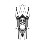 Het centrale deel van het corset is voorzien van decoratieve veters, die een elegante, speelse uitstraling geven en tegelijkertijd de verticale lijnen van het lichaam benadrukken. De zachte materialen sluiten comfortabel aan op de huid, waardoor de set niet alleen verleidelijk oogt, maar ook prettig draagt. Dankzij de verstelbare jarretelles kan het corset eenvoudig gecombineerd worden met kousen, zodat je de look volledig naar wens kunt stylen.
