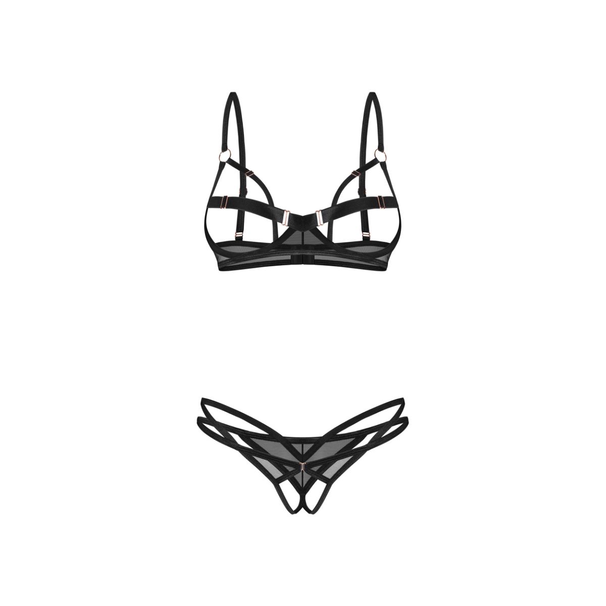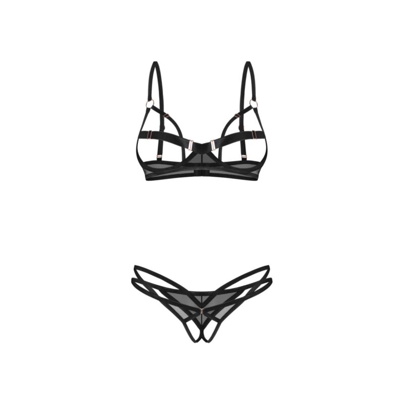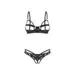Laat je eigenzinnige en krachtige kant spreken met deze tweedelige set die speciaal is ontworpen voor wie geen concessies wil doen. Het ontwerp combineert een open bh en een uitgesneden string die samen een moderne, opvallende en zelfbewuste uitstraling creëren. De bandjes rond de buste vormen een intrigerend lijnenspel, waardoor de vormen subtiel worden omlijst en extra accent krijgen. Dankzij de beugelondersteuning blijft de bh stevig en comfortabel zitten, terwijl het open design zorgt voor een spannende en speelse look.