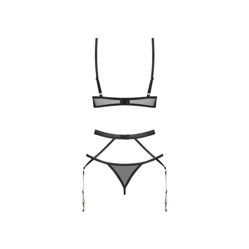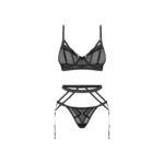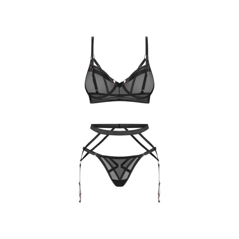 De garter belt vormt het middelpunt van het ontwerp en legt de focus op de taille met een moderne, open structuur die het geheel een sterke en vrouwelijke uitstraling geeft. De bijpassende string sluit perfect aan op de rest van de set en zorgt voor een harmonieuze, sensuele balans. Iedere beweging voelt licht en vrij dankzij het zachte materiaal dat soepel meebeweegt met het lichaam.