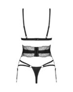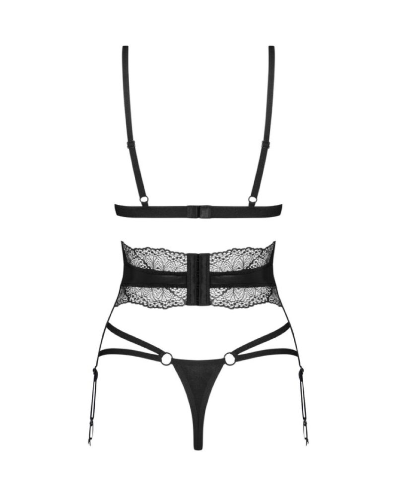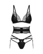 Geniet van de verleiding van de Lobellis-set: bh, jarretelgordel en string. Elk stuk is zorgvuldig ontworpen met oog voor detail. De combinatie van kanten accenten en zwarte stof creëert een perfecte harmonie. Dankzij de haaksluiting aan de achterkant, verstelbare bandjes en sensuele details gaan comfort en verleiding hand in hand.