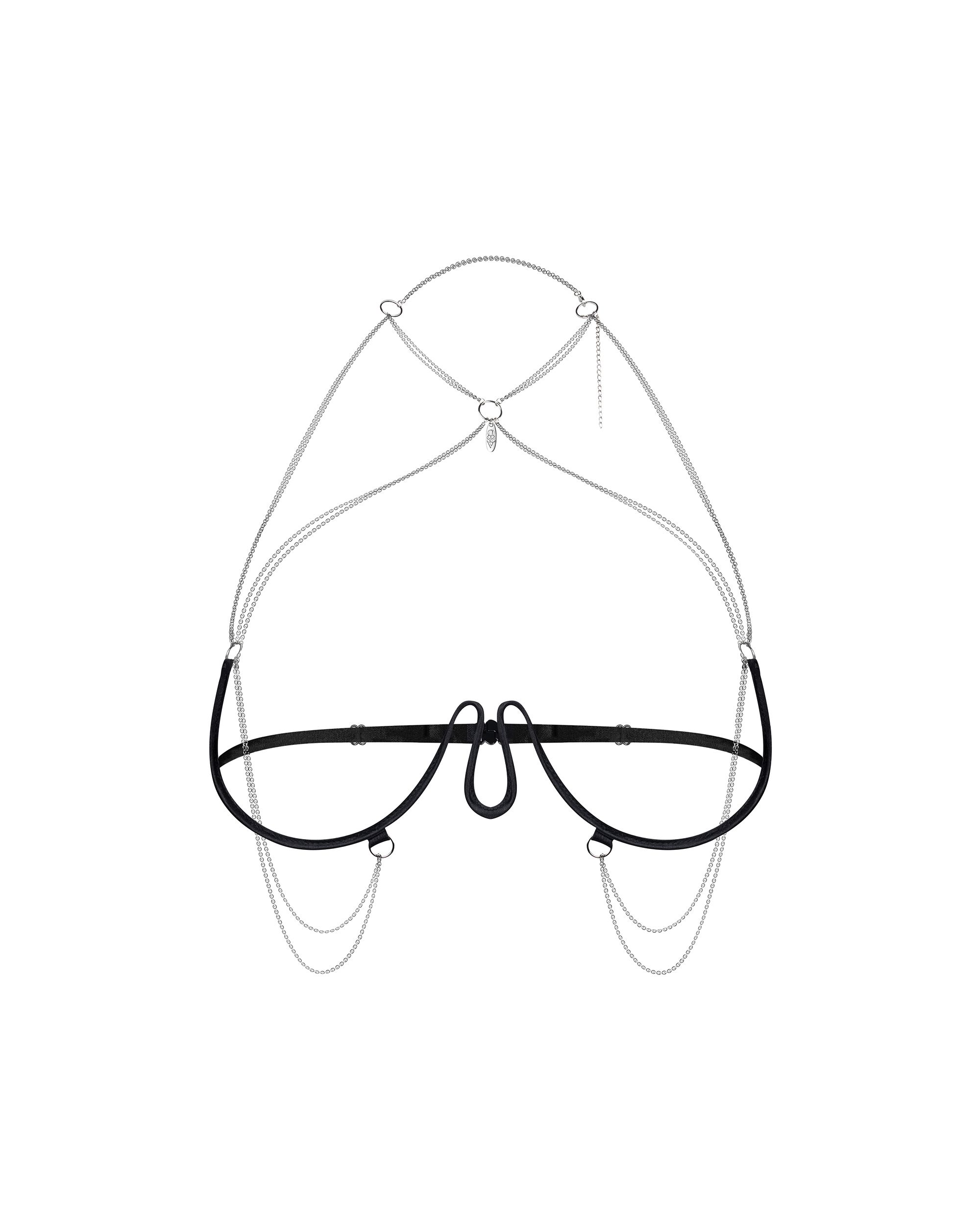 Verleid met verfijning in de Lustique Harnas BH van Obsessive. Deze zwarte harness top heeft een open ontwerp met subtiele versteviging onder de buste, waardoor je decolleté prachtig geaccentueerd wordt. De zilverkleurige kettingen lopen sierlijk over je schouders en taille en geven de look een luxe, sieradenachtige uitstraling.
