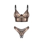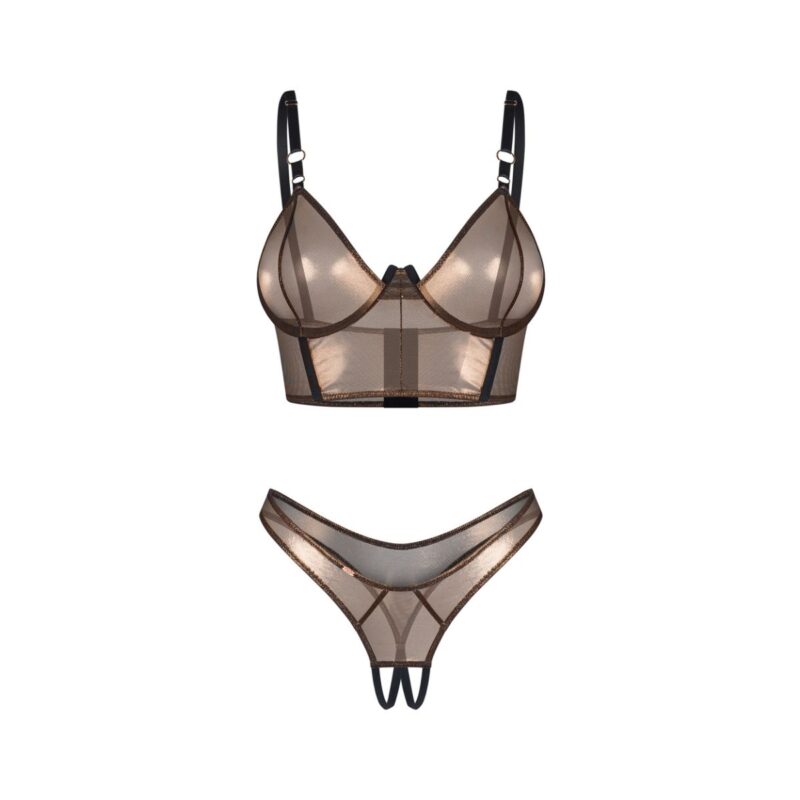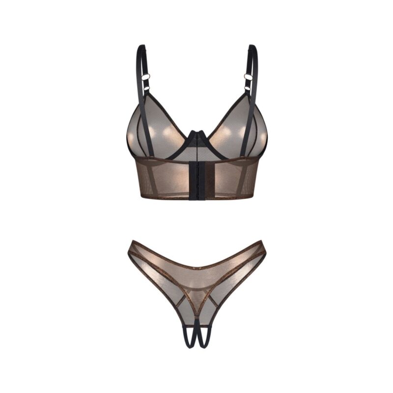 Ontdek een combinatie van verfijning en gedurfde sensualiteit met deze tweedelige Soranna-set. De top omhult het lichaam met transparante, zacht glinsterende mesh die een luxueuze uitstraling geeft en de natuurlijke vormen prachtig laat uitkomen. De beugels en subtiele versteviging zorgen voor een elegante contour, terwijl de verstelbare elementen je toelaten de pasvorm volledig naar wens af te stemmen.