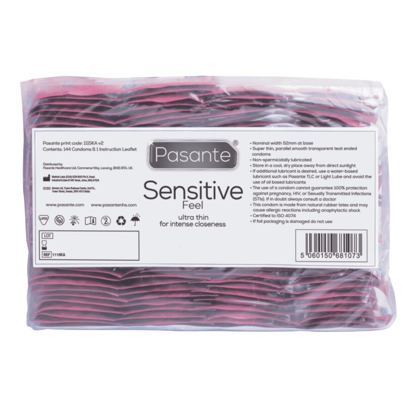 De Pasante Sensitive Condoom is dunner dan de meeste standaard condooms. Door de goede warmtegeleiding voel je dezelfde intense beleving als wanneer je geen condoom draagt. De condooms zijn gemaakt van natuurlijk latex en voorzien van glijmiddel en een reservoir. Nominale breedte: 52 mm