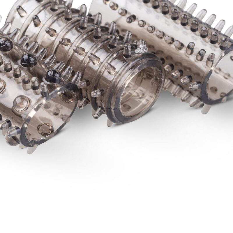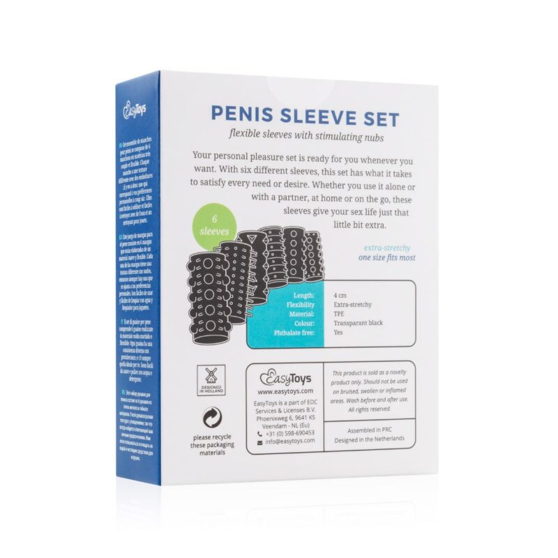 Maak je intieme momenten nog intenser met deze penis sleeves! Doe de sleeves om je penis om je partner extra te stimuleren. Ook kun je de sleeves om een dildo, vibrator of andere toy doen voor extra stimulatie tijdens penetratie. De sleeves hebben alle zes een andere externe structuur met ribbels en noppen. Ze zijn zeer rekbaar, zodat ze altijd passen. Maak de sleeve voor en na gebruik schoon met toycleaner voor een goede hygiëne.