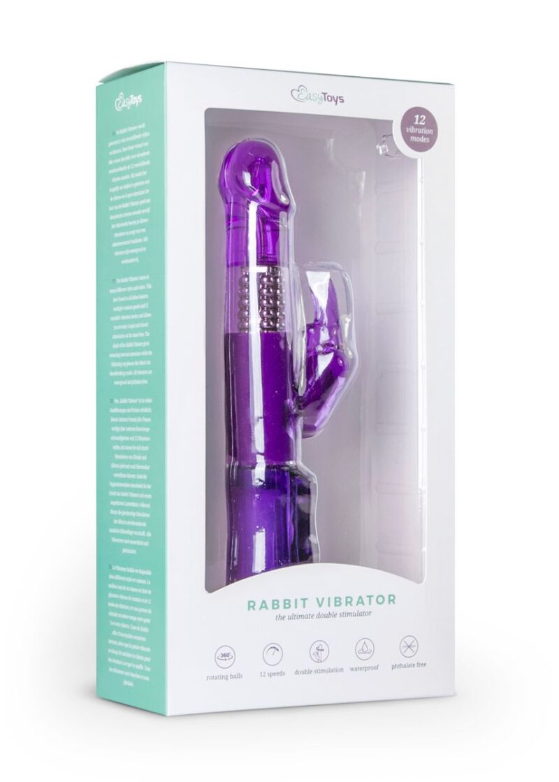 Paarse rabbit vibrator uit de EasyToys collectie. Deze spannende rabbit vibrator zal jou optimaal verwennen! De roterende hals geeft een ongelooflijke interne stimulatie terwijl ondertussen de oortjes van de rabbit jouw clitoris kietelen. Met deze dubbele stimulatie heb jij gegarandeerd een spetterend hoogtepunt! Kies een van de rotatiesnelheden en kies uit 12 verschillende vibratie standen. Je zal nooit meer iets anders willen!
