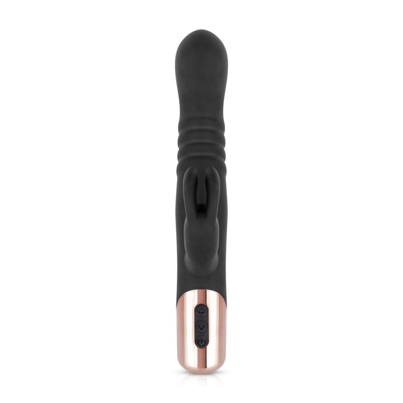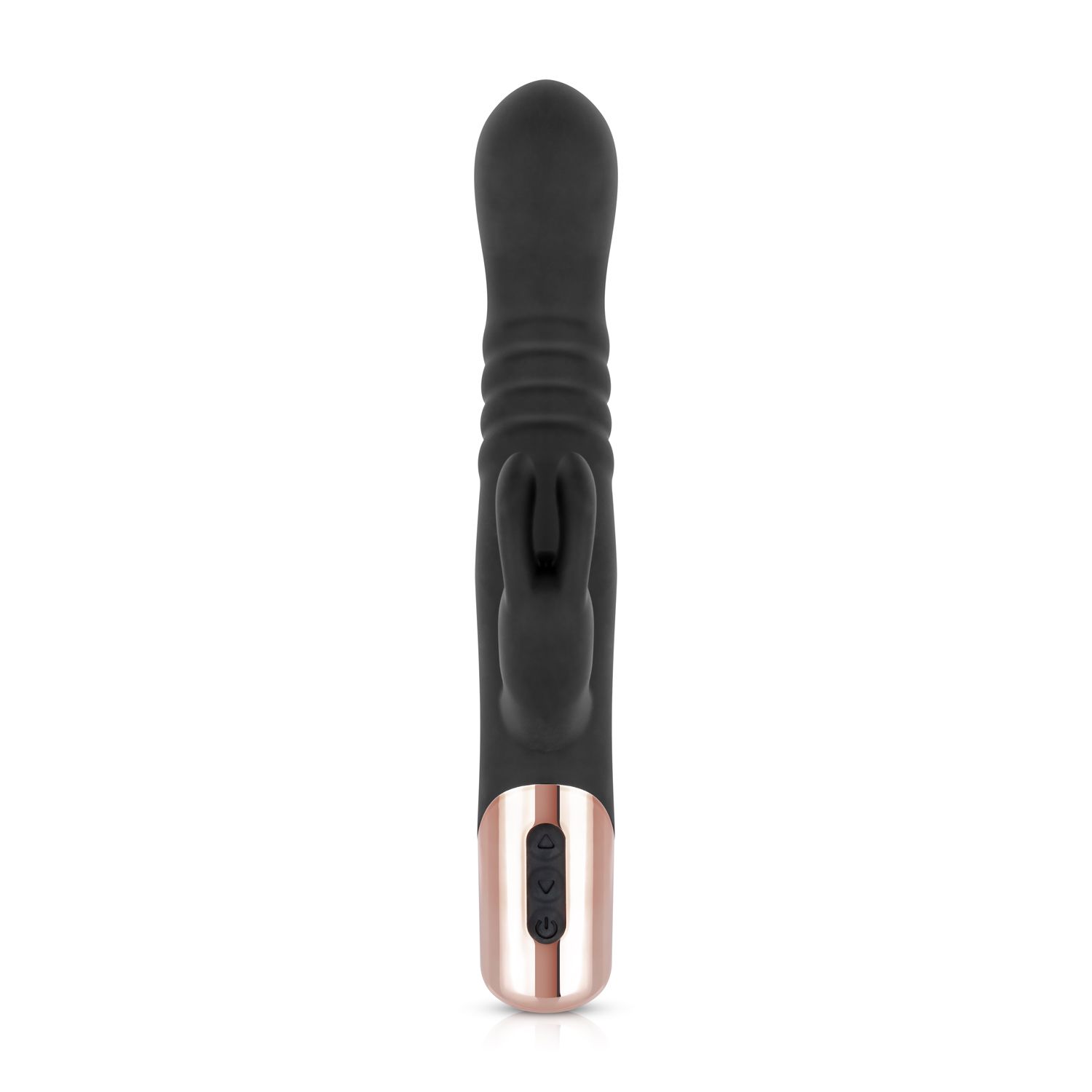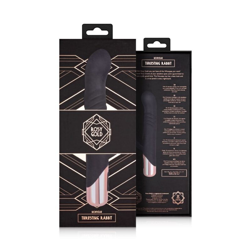 Stap in de charme van de Roaring Twenties met de Rosy Gold Rabbit vibrator, een verfijnde combinatie van zwart siliconen en roségouden details. Met 10 vibratie- en stootstanden en een inbrengbare lengte van 13 cm heeft deze elegante toy ook een rabbit-gedeelte voor clitorisstimulatie, wat zorgt voor een gebalanceerde en zeer bevredigende ervaring. USB-oplaadbaar, het combineert moderne technologie met een tijdloze, klassieke uitstraling. Perfect voor degenen die zowel stijl als functionaliteit waarderen.