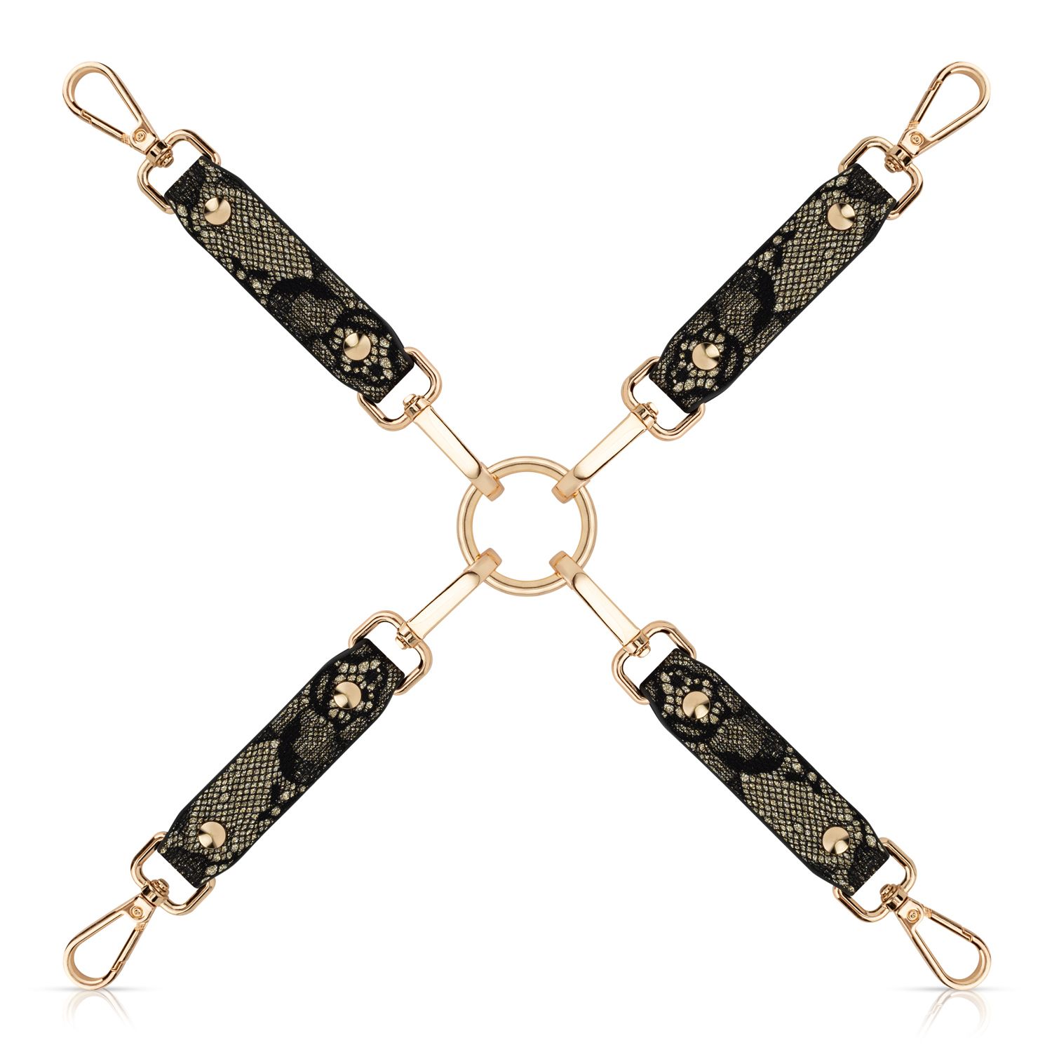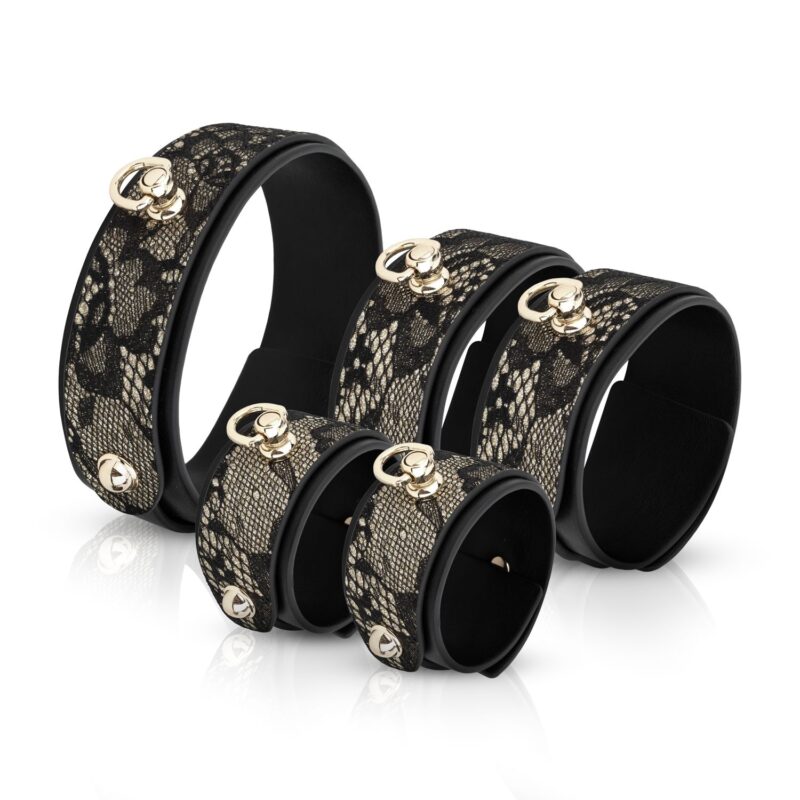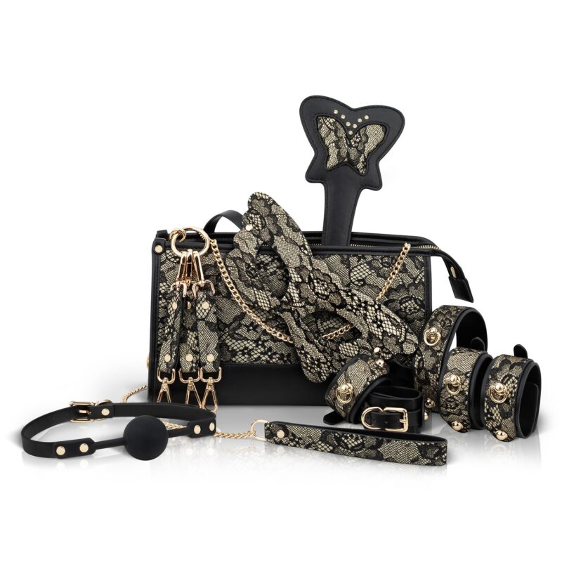 Binnenin is elk stuk een meesterwerk, versierd met fijne kant en gouden accenten – een perfecte harmonie tussen kink en klasse. Of je nu je nieuwsgierigheid wilt bevredigen of je intimiteit wilt verdiepen, deze set maakt elk moment onweerstaanbaar opwindend.