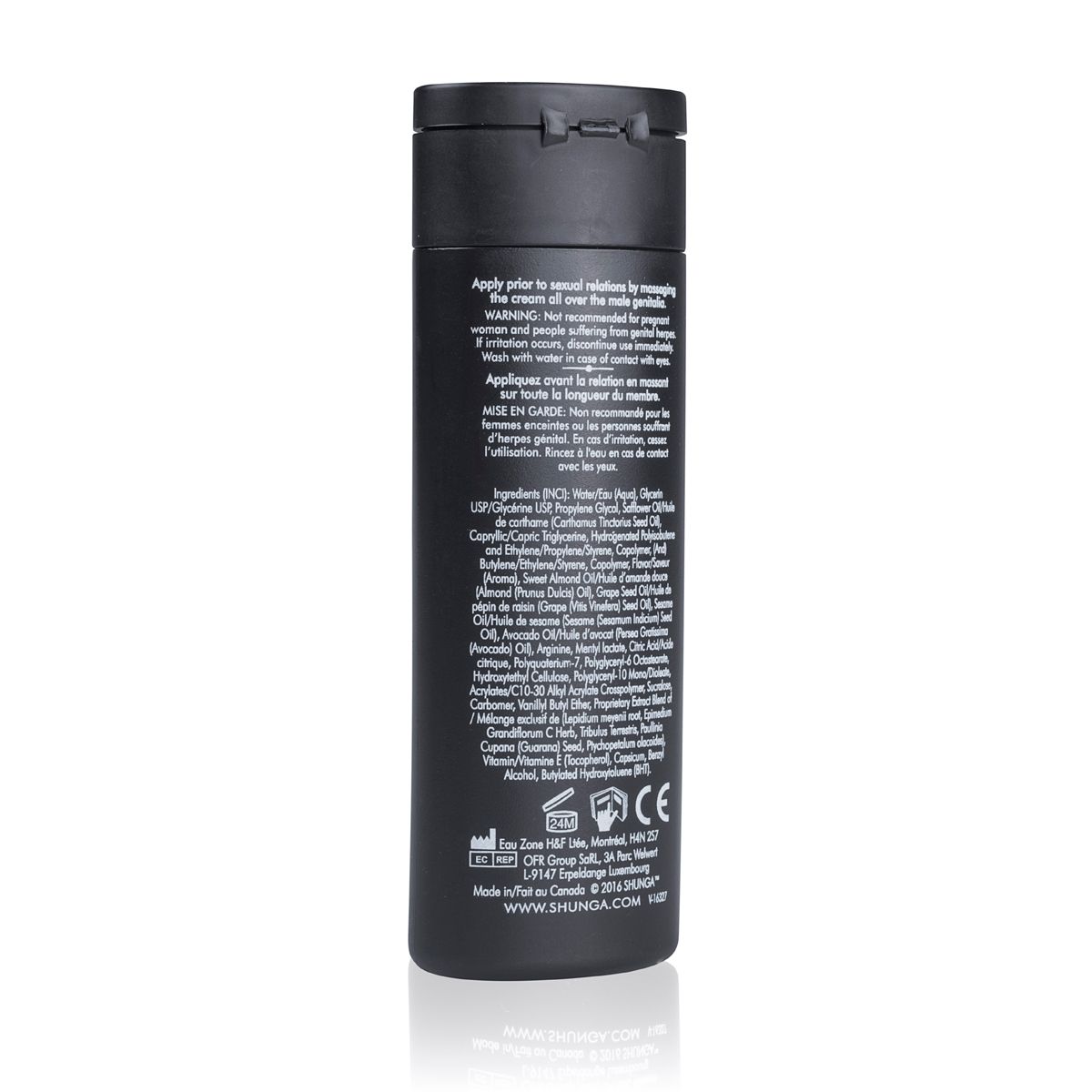 Ingrediënten: aqua, glycerin, hydrogenated polyisobutene ethylene, propylene, styrene copolymer (and) butylene, ethylene, styrene copolymer, propylene glycol, safflower oil, polyquaternium-7, caprylic/capric triglyceride, sweet almond oil, menthyl lactate, grape seed oil, sesame oil, avocado oil, aroma, decaglycerol decaolate, hydroxyethyl cellulose, acrylates/C10-30 alkylacrylate crosspolymer, decaglycerol oleate, L-arganine, carbomer, proprietary extract, sucralose4, vitamin E, vanillyl butyl ether, capsicum OR, benzyl alcohol.