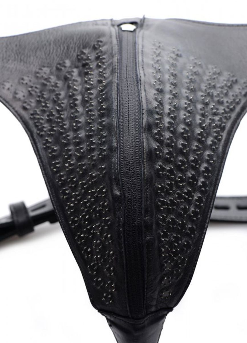 Deze leren kuisheidskooi van Sctrict Leather gaat verder dan je meest duistere fantasieën. De leren jockstrap is stoer, uitdagend en voorzien van tientallen kleine spikes die in en rondom de geslachtsdelen prikken tijdens het dragen. Ervaar de scherpe puntjes bij elke beweging of beveel je sub om de kuisheidskooi te dragen. De jockstrap heeft verstelbare banden en een vergrendelbare rits. Hierdoor wordt het onmogelijk om de kuisheidskooi uit te doen zonder sleutel.